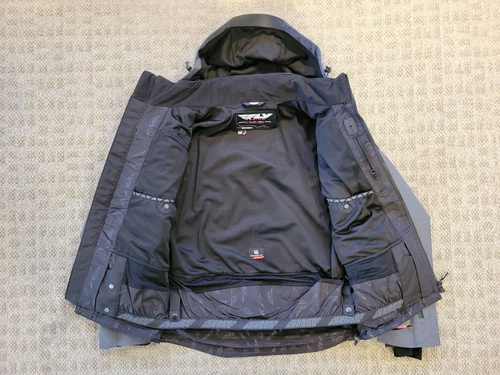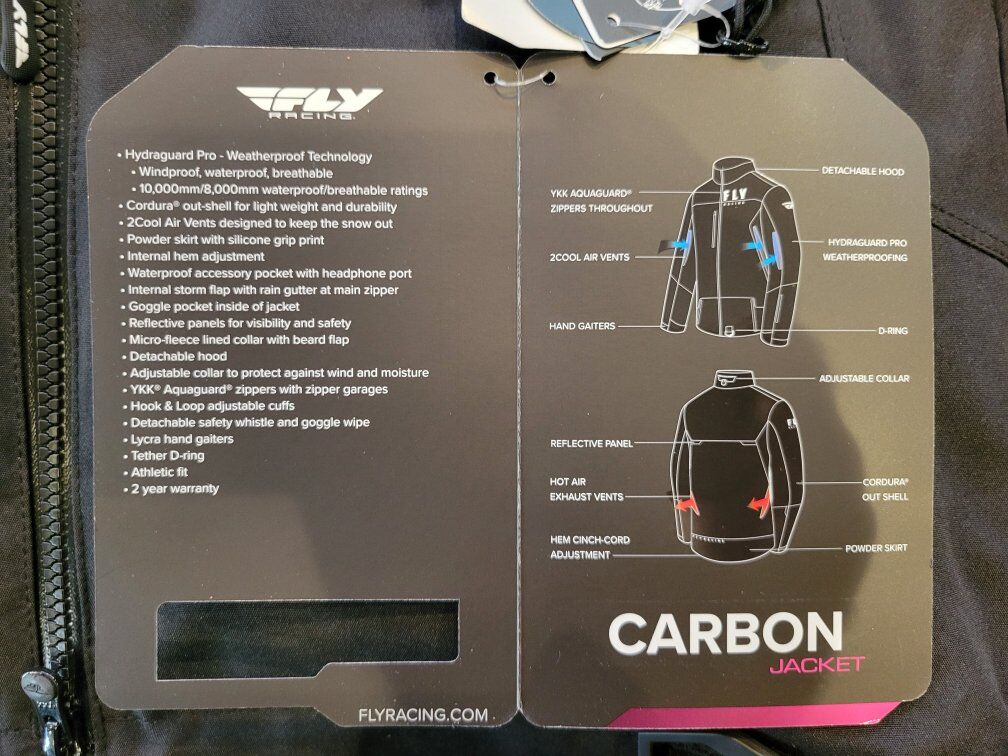 New Women's Carbon series snow jacket shell by Fly Racing. Factory tags attached. Designed for the aggressive snowmobile rider but works great for all snow related activities. -Women's size Small (Athletic fit so true size is like an XS) -10,000mm/8,000mm Waterproof/Breathable rated -Made of Cordura so it is lightweight but highly durable -Non-insulated -6 zippered vents for optimal airflow -Removable hood -Powder skirt -Wrist gaiters Originally $300 Price is firm