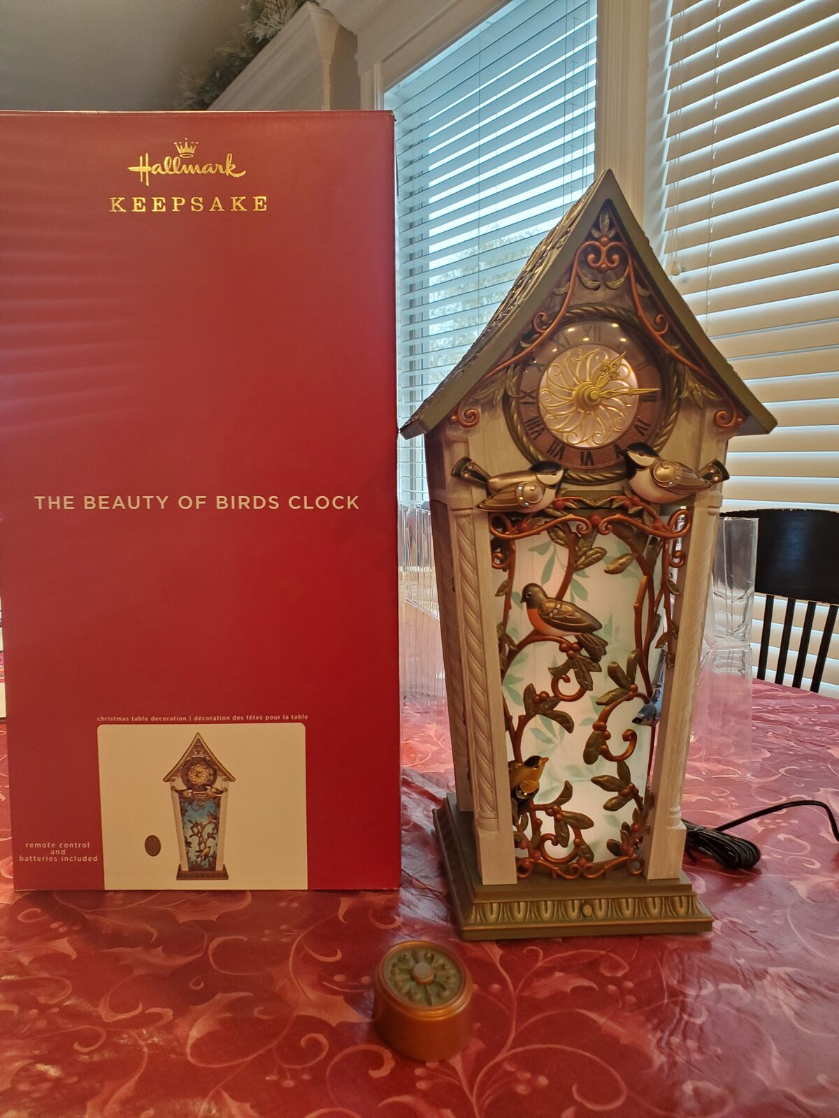 2020 Hallmark The Beauty of Birds Clock new in box. It features a birds-and-berries design that plays a soothing song with chirps and tweets as it chimes every hour. It also performs a sound and light show with motion when you press the button on the front of the clock or use the remote control (included). You can set on tabletop or hang it on the wall.