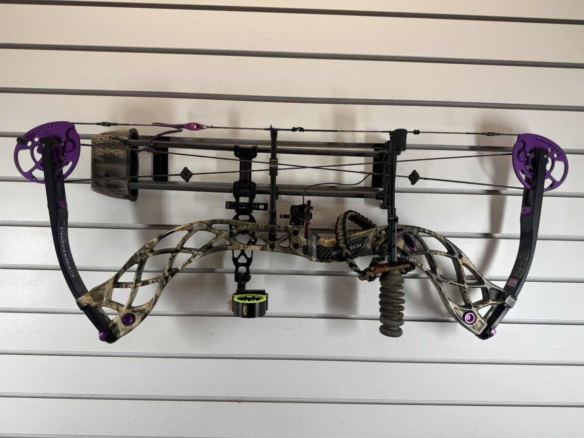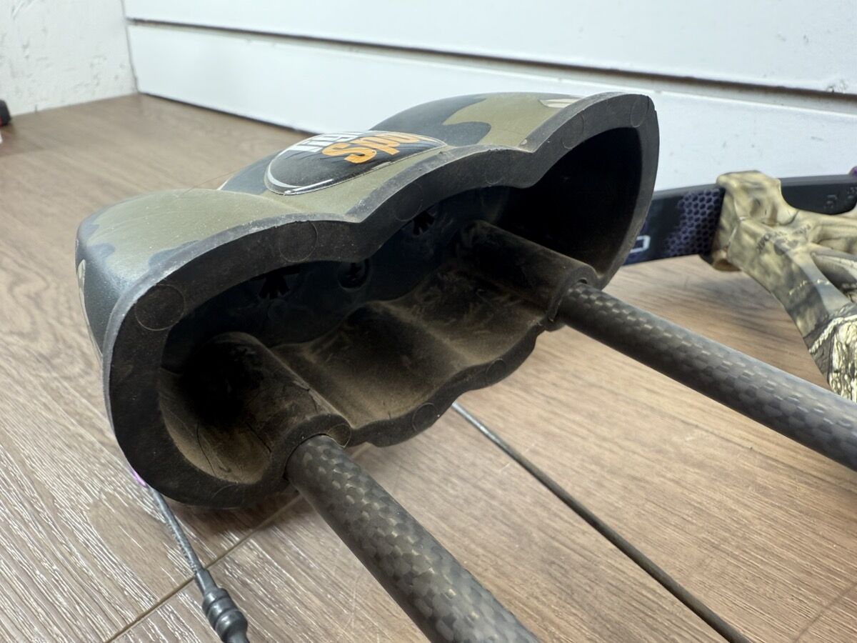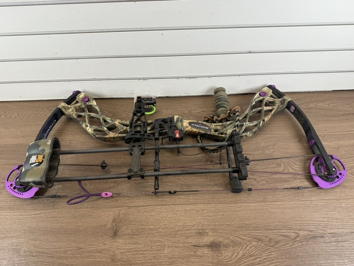 GooglePayBOW: BOWTECH MODEL CARBON ROSE COMPOUND BOW, 70# DRAW WEIGHT, 29" DRAW LENGTH, CAMO, WITH QUIVER AND FIBER OPTIC SIGHT, SERIAL NUMBER E97037,