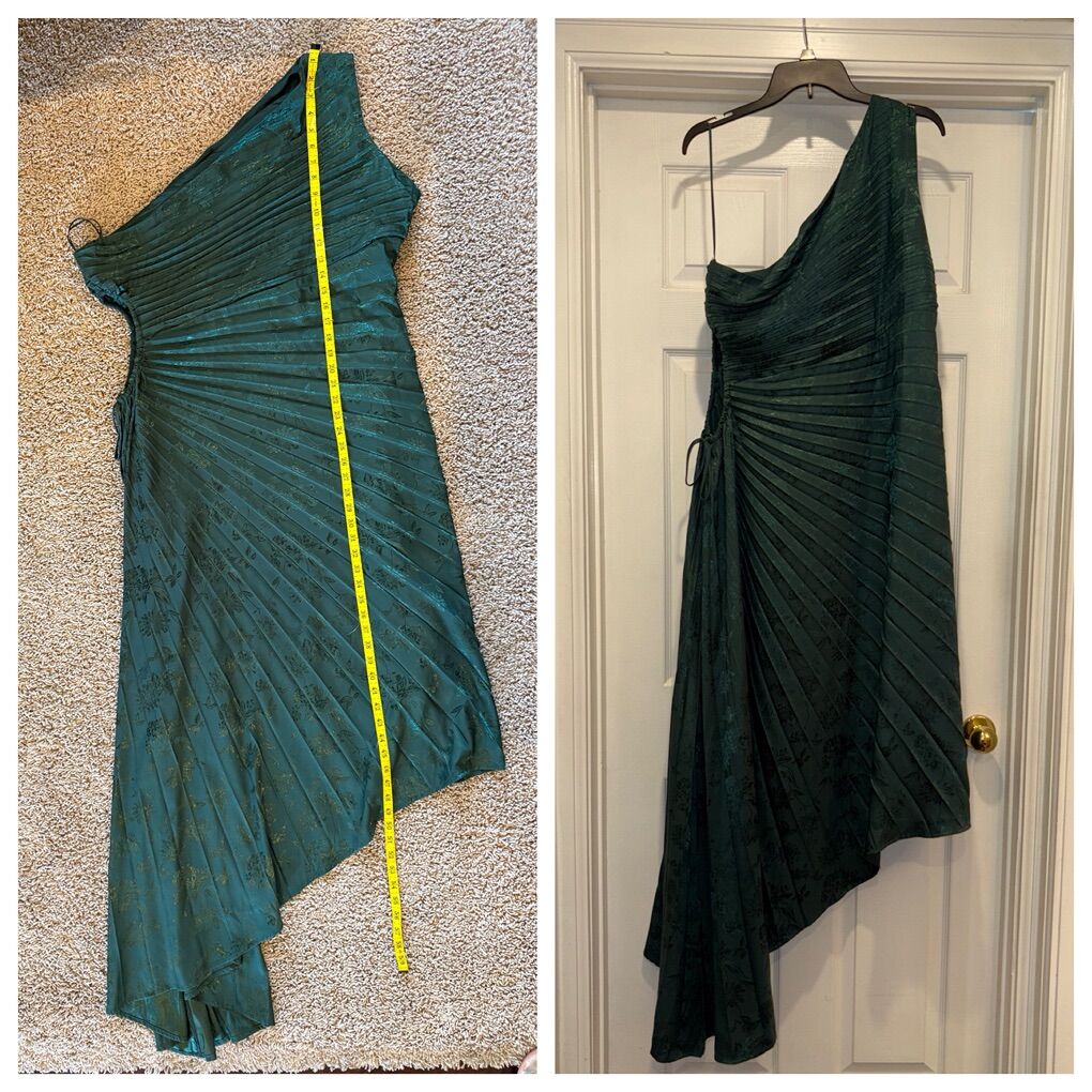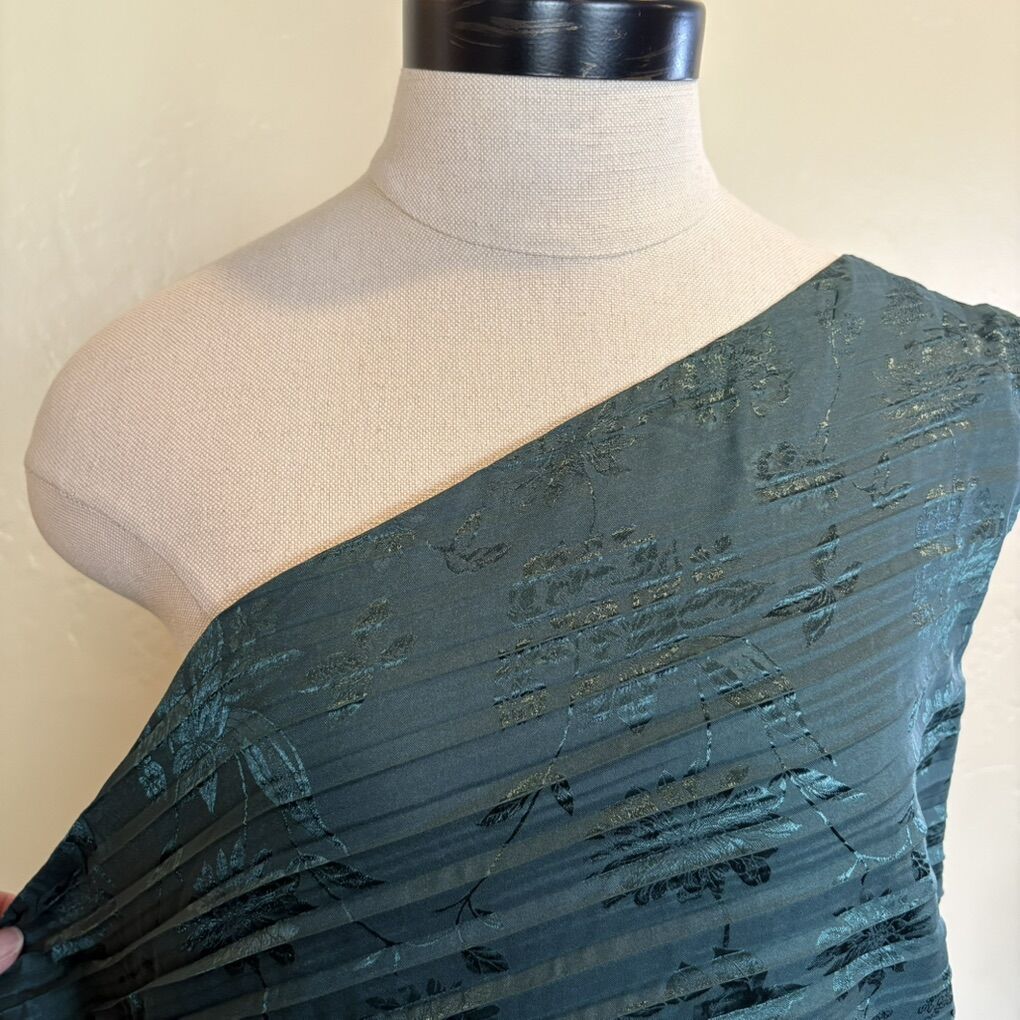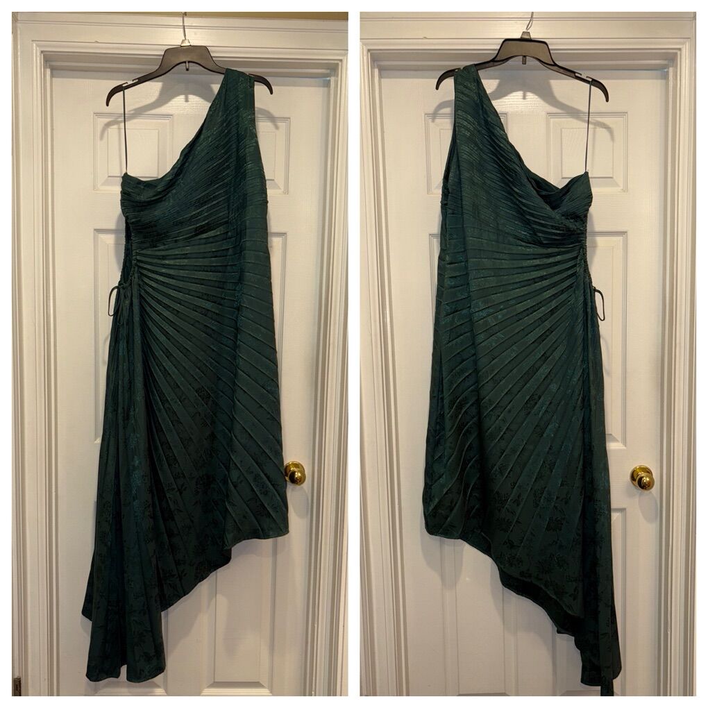 New with tags D4905A XXL NY&Co Polyester/spandex blend Asymmetrical Jacquard, Emerald Green One shoulder Cocktail, holiday, Christmas dress Round cut out with tight closure at waist Pleated fabric $50