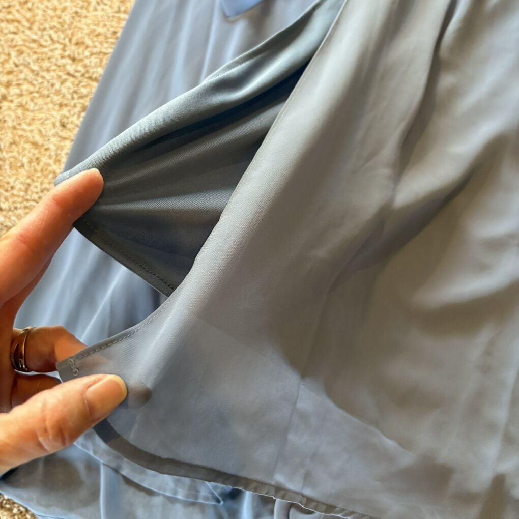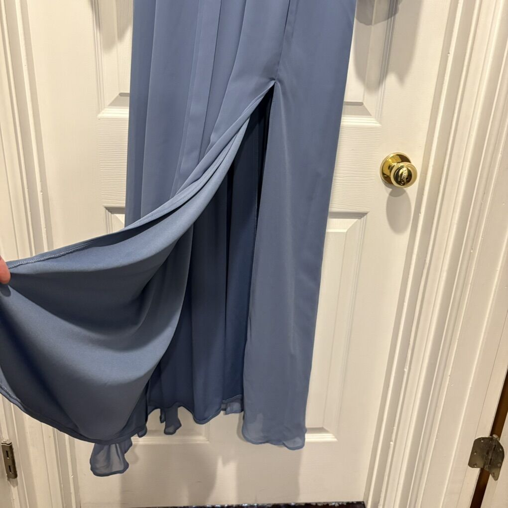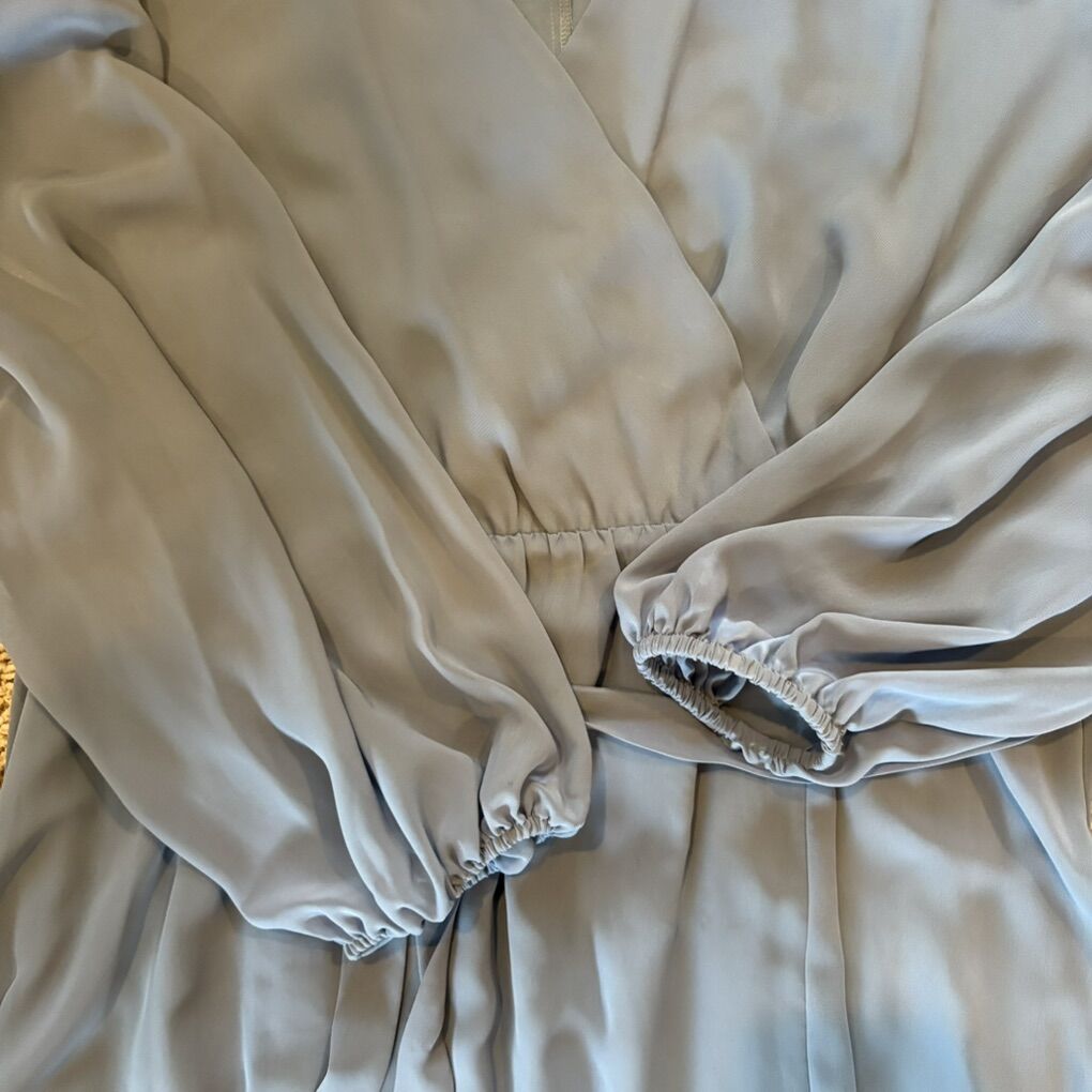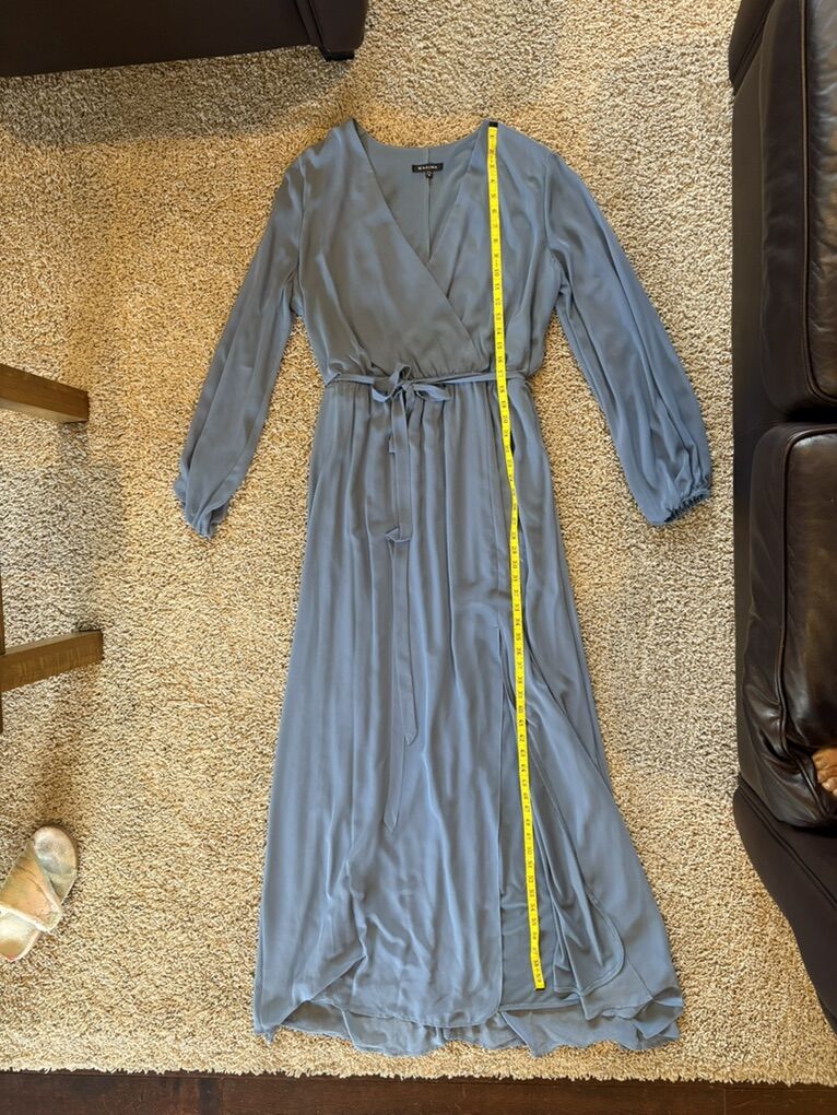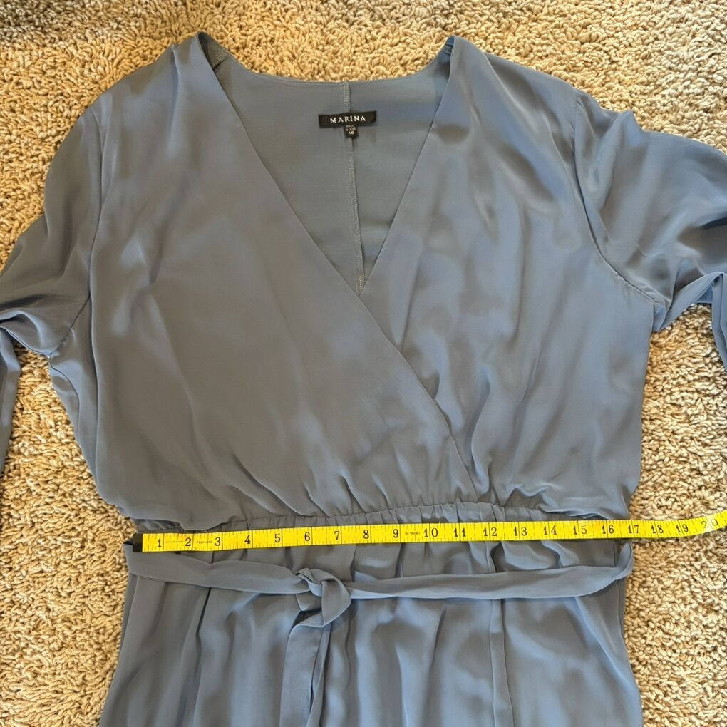 Size 16 W60041 Worn once, excellent condition Chiffon Faux wrap Long sleeves Lined Elastic waist with tie Slit in front Dusty blue The surplice neckline and elastic waist of this faux-wrap chiffon gown flatter your figure, as long sheer sleeves provide an unexpected touch. $40