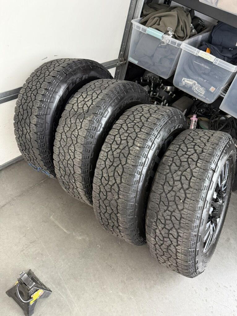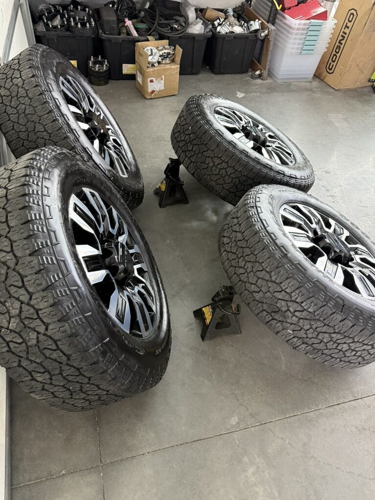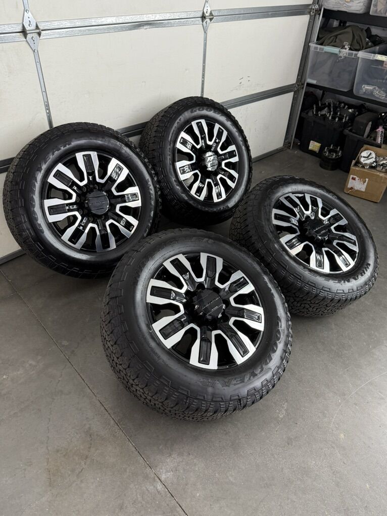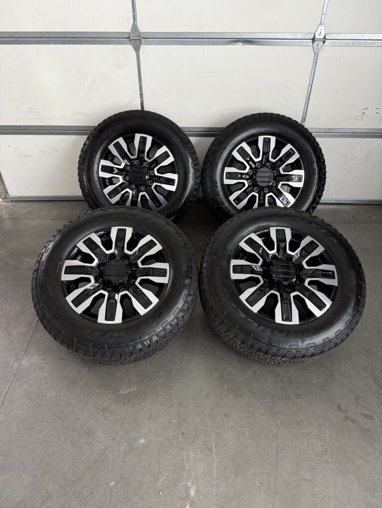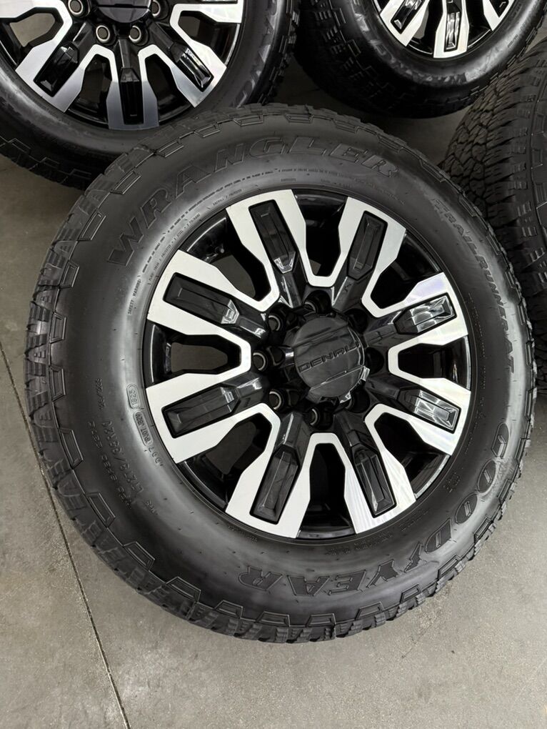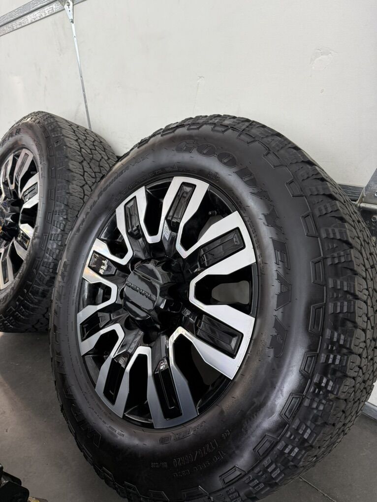 Wheels are 20in OEM wheels off a 2025 gnc Denali ultimate. Wheels are in like new shape, no curb rash or damage. They look as if they just came off the assembly line. All of the center caps are also included and in like new shape as well. Tires are 275/65/20 Goodyear wrangler all terrain, load range E, top of the like tires, no patches or plugs tires have about 85-90% tread left.