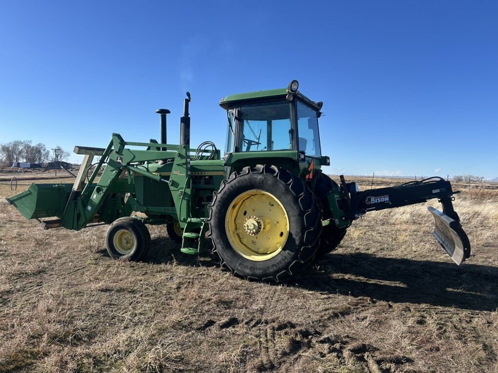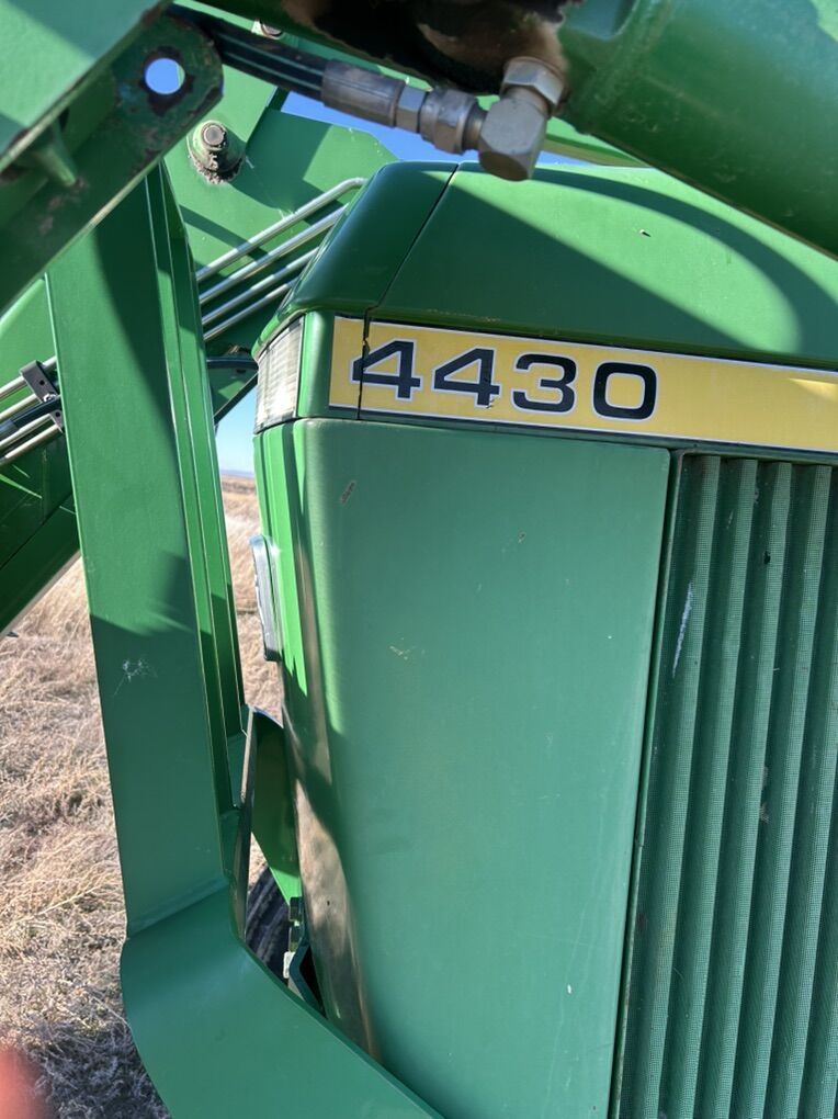 John Deere 4430 This tractor has been taken care of an maintained extremely well. Tractor has just over 7,000hrs on it. Has heat/AC and radio. Has quad range transmission. With a quick hitch on the rear. Rubber is in good shape. It has the larger loader on it. Self leveling John Deere 740 classic. Those alone are not cheap. The loader was put on correctly with a single lever joy stick installed. Has a bucket and a set of bale forks for it. Also have a Bison Hydraulic angle blade that has hydraulic angle and tilt that i can sell with it for a little more. This is a great tractor. Come take a look for yourself. Call or text Dalton 2086803829