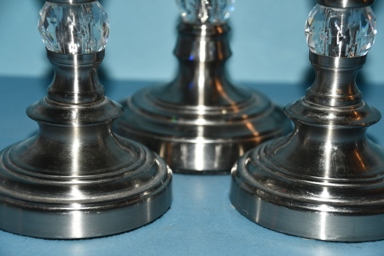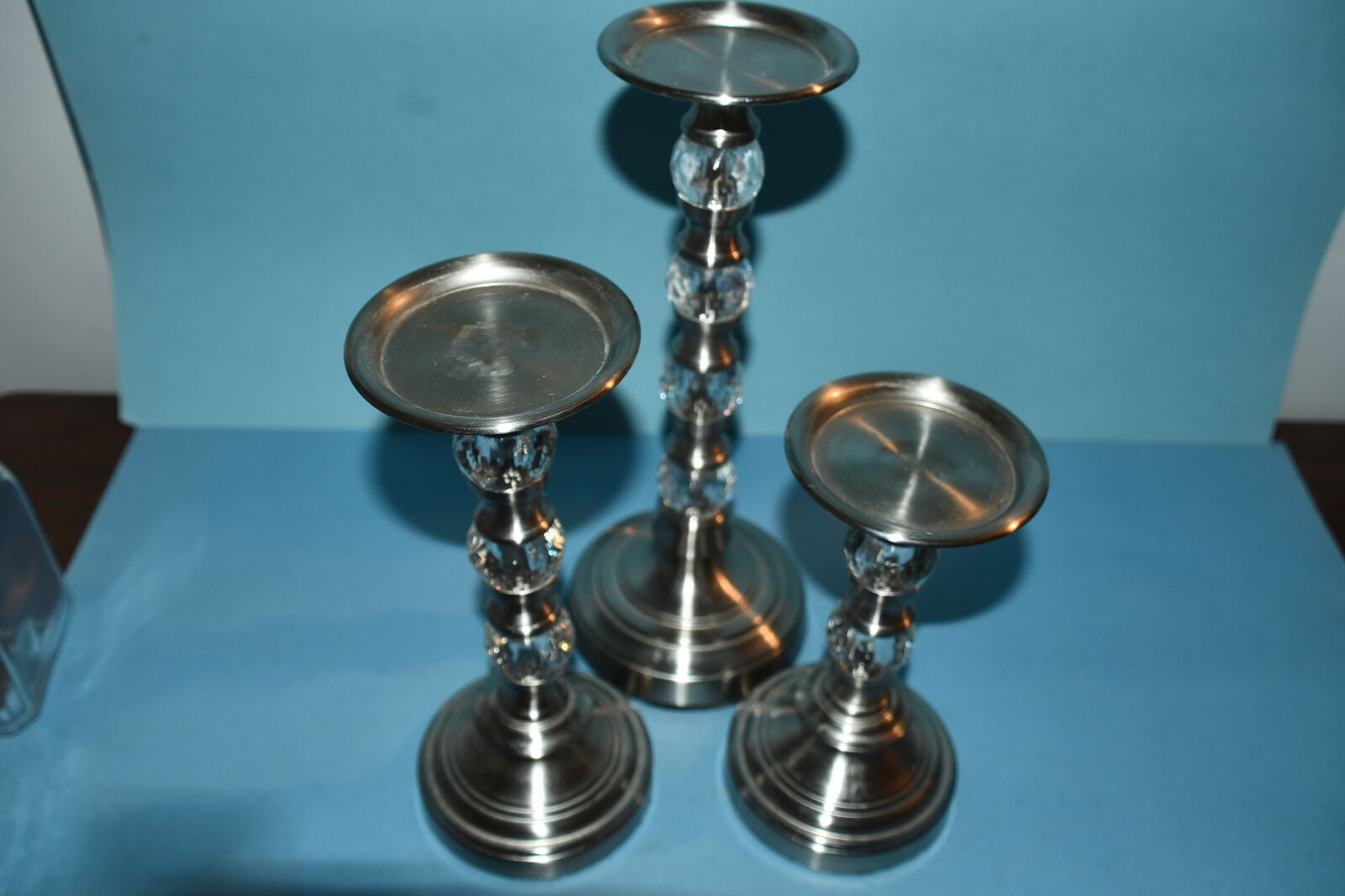 This Set of 3 METAL CANDLE HOLDERS are from a smoke free home. They hold a 3" CANDLE. Our home is smoke free. Questions??? Please ask. We are located in Plain City. Cash only please.