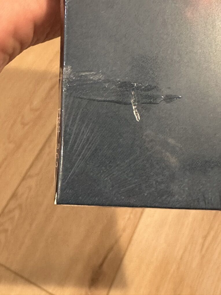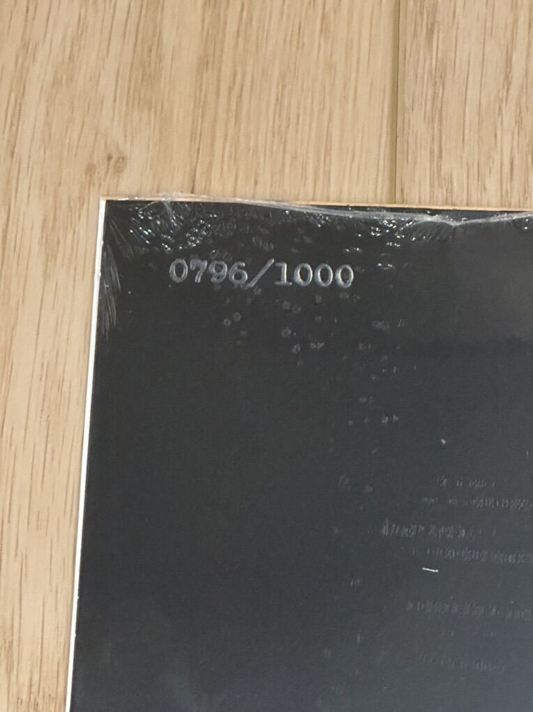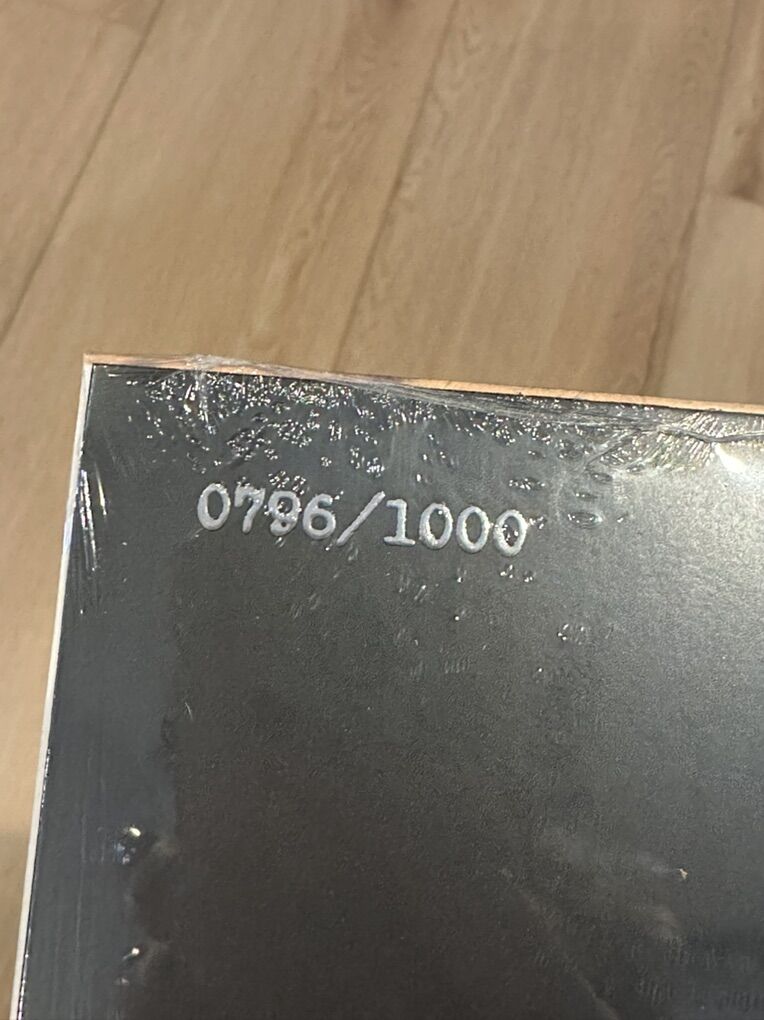 It has a mark on the front bottom left. I have no idea what it is because it is under the plastic but there are pictures of it. It looks raised and is on the black so you can’t see it super well. But it’s for sure there so make sure you see it. I missed it when I first looked at the album probably because of the plastic so make sure you look at it and know it’s there before buying.