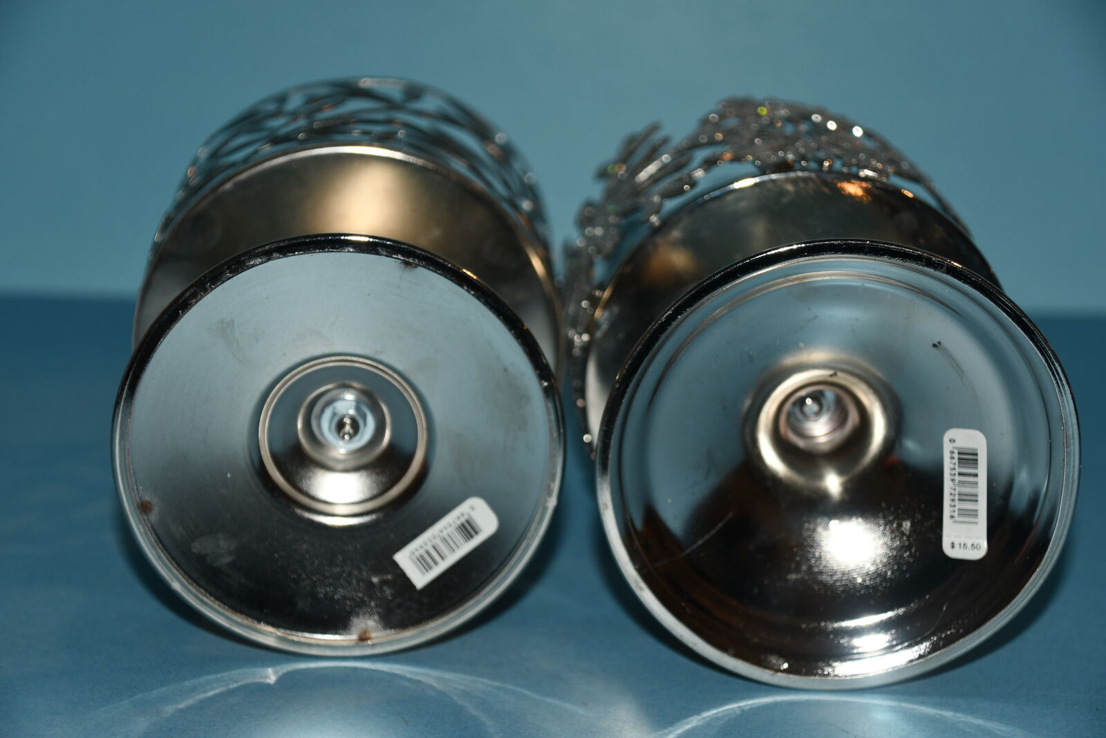 This Set of 2 BATH & BODY WORKS CANDLE HOLDERS are about 6" & 6.5" in height. They hold a 4" CANDLE. They are SILVER. Our home is smoke free. Questions??? Please ask. We are located in Plain City. Cash only please.