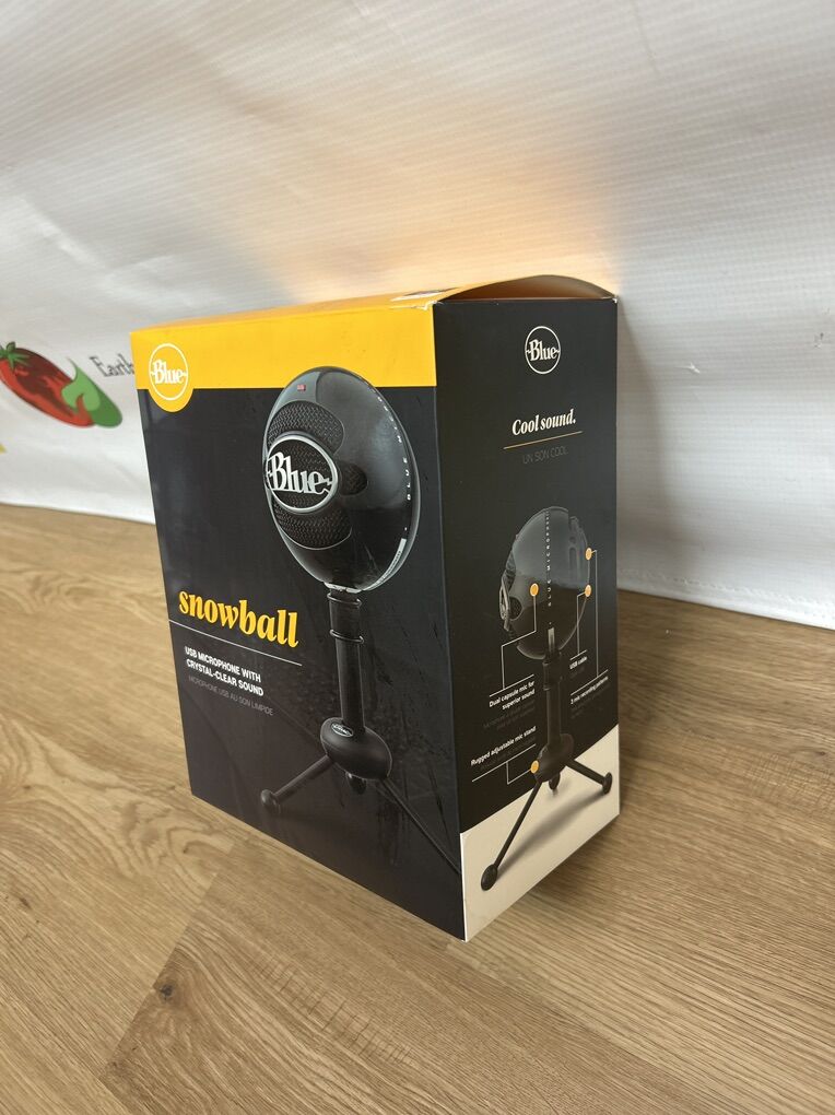 This Black Blue Snowball USB microphone has been opened but never used. It’s in like-new condition and ready to plug in and record.