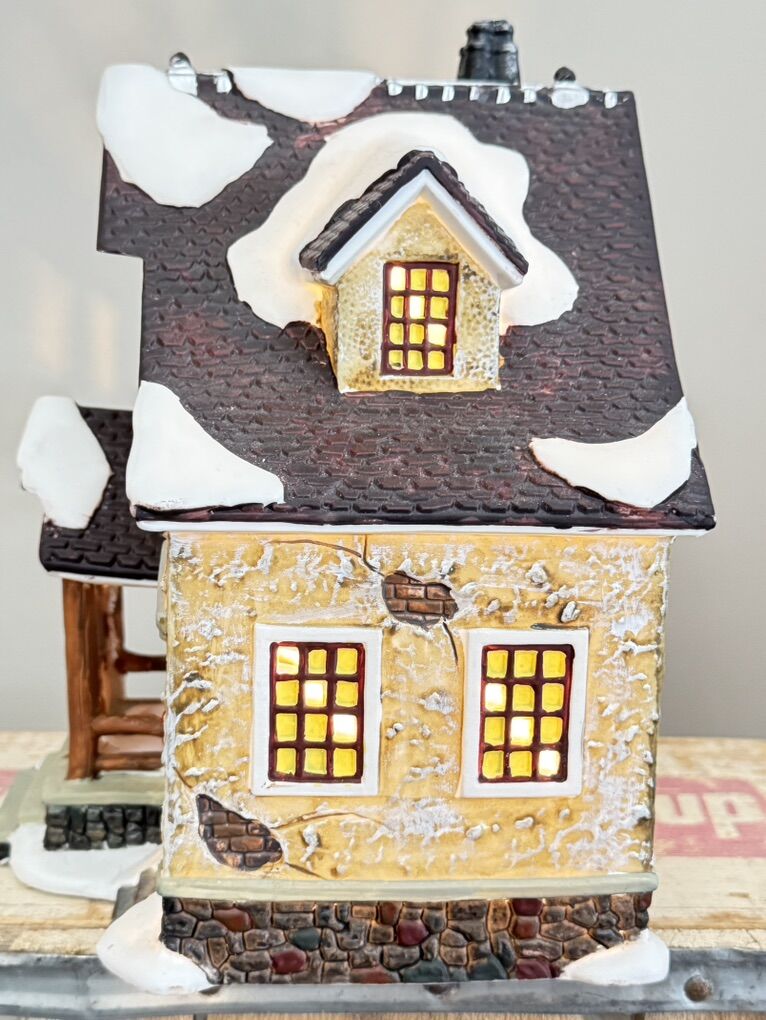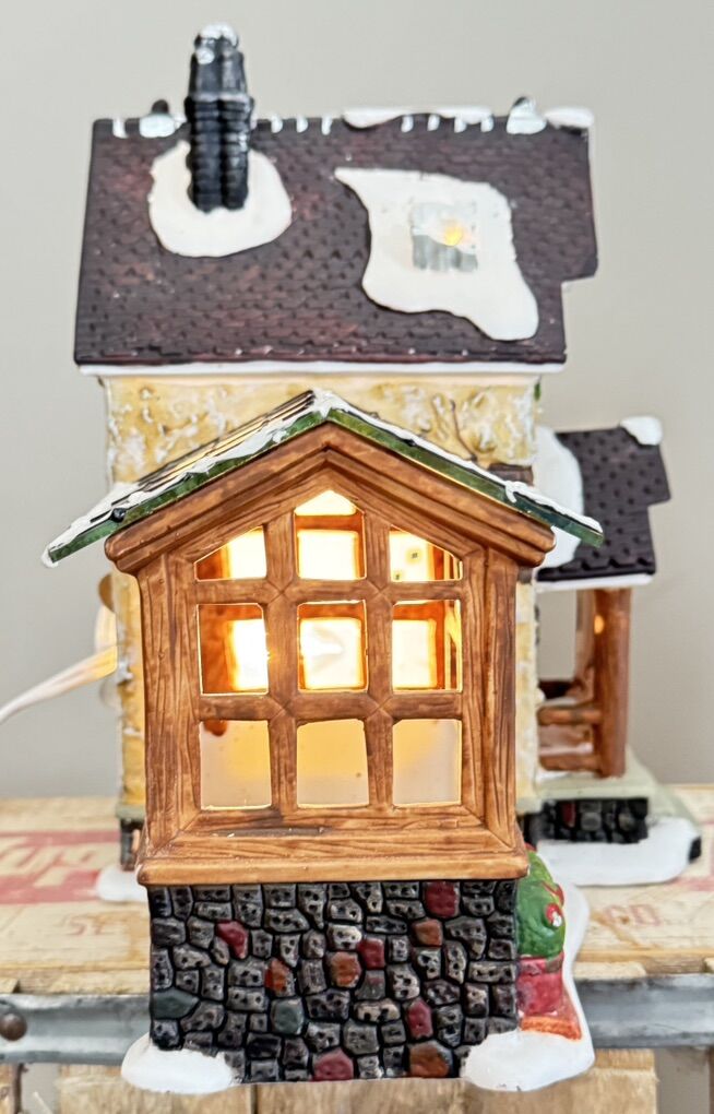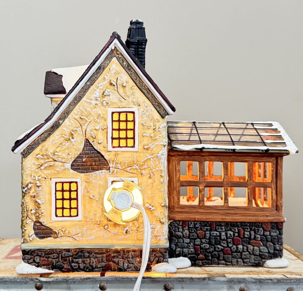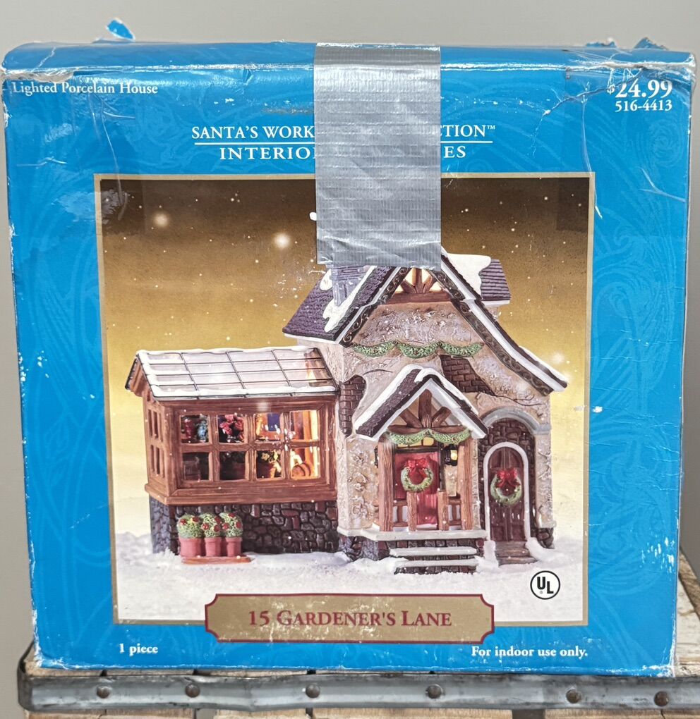 VenmoPre-Owned Santa’s Interior Series collection. Good condition. Why I say good is because one little chimney had been broken off. Piece can be glued back on with very little notice of being broken off. Has box but not in great condition. On the box it shows items in the little greenhouse but it came with no extra accessories. 8 1/2” L X 8 1/2” H. Comes with electric light.