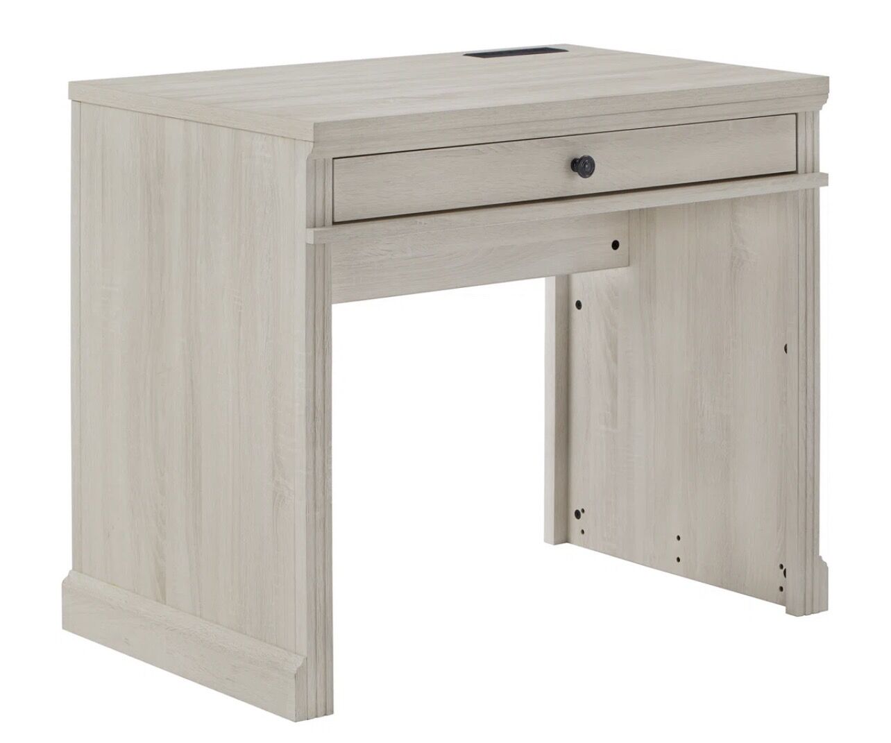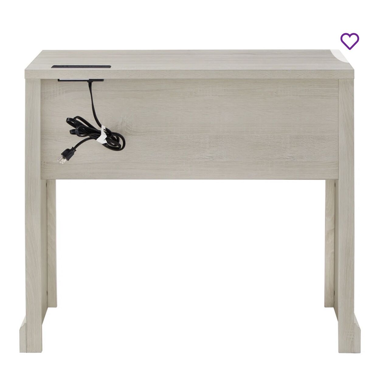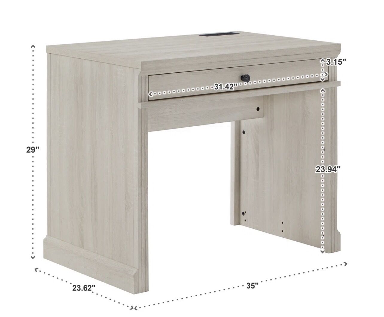 Desk features a simple silhouette and a distressed finish that bring a cozy cottage vibe to your home office or living area. A 35" wide desktop is the ideal size for papers, a laptop, and other office essentials. Plus, it comes with a single drawer that has vintage-inspired black metal hardware. Made from engineered wood, this desk exudes modern farmhouse charm wherever you put it. The best part? Two USB ports and two outlets on the top make it a cinch to keep all your electronics powered up.