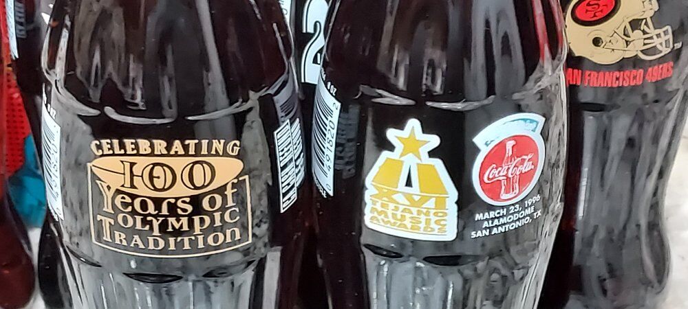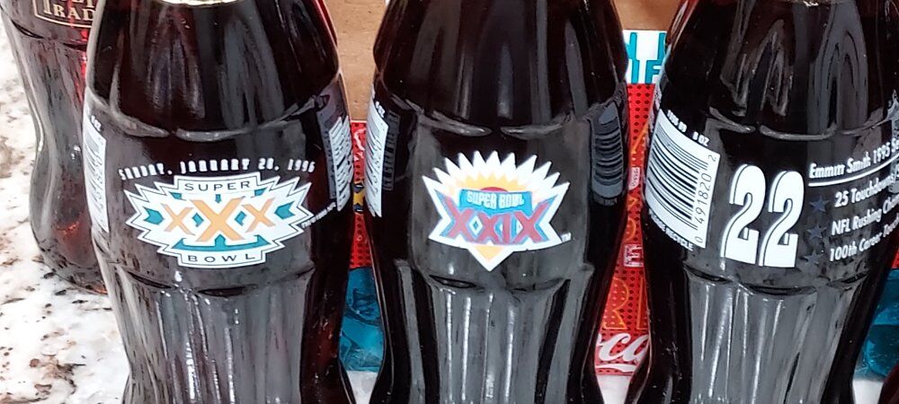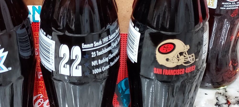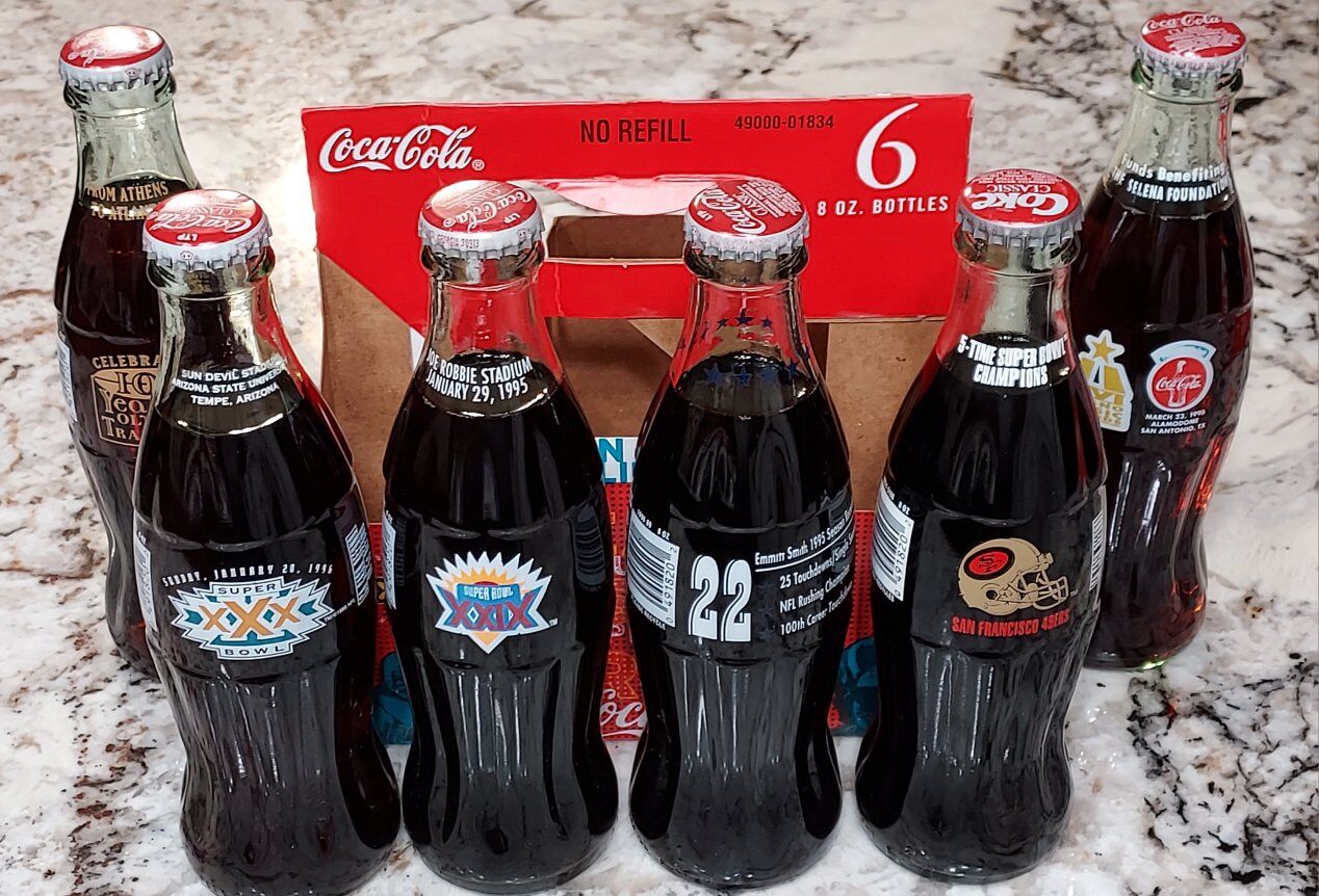 2- six packs NFL football Coca Cola bottles. super bowl 33 there are 6-bottles, 1- super bowl thirty, 1-super bowl 29, 1- San Francisco 49ers 5- time super bowl champions, 1-Emmit Smith 1995 stats bottle, 1- Olympic 100 years celebration, 1- 29th music awards bottle. All are sealed and unopened collectible bottles.