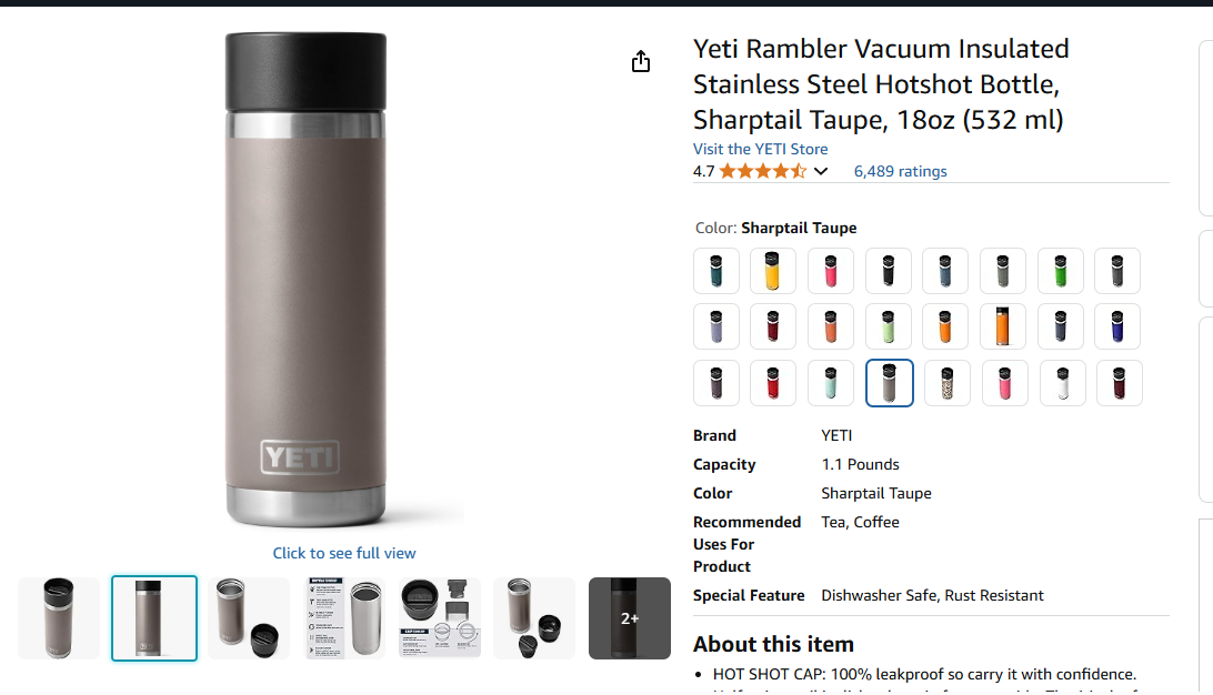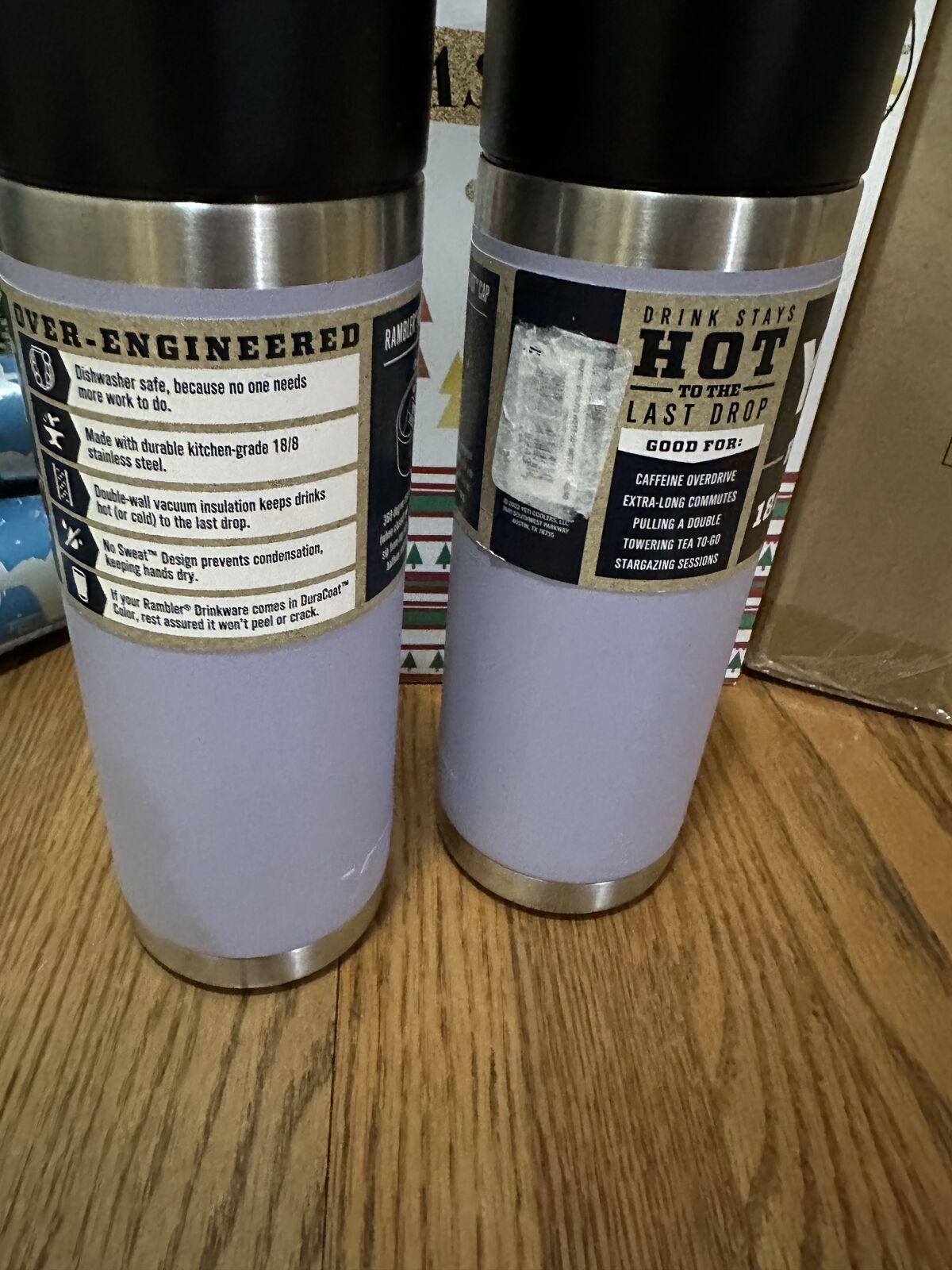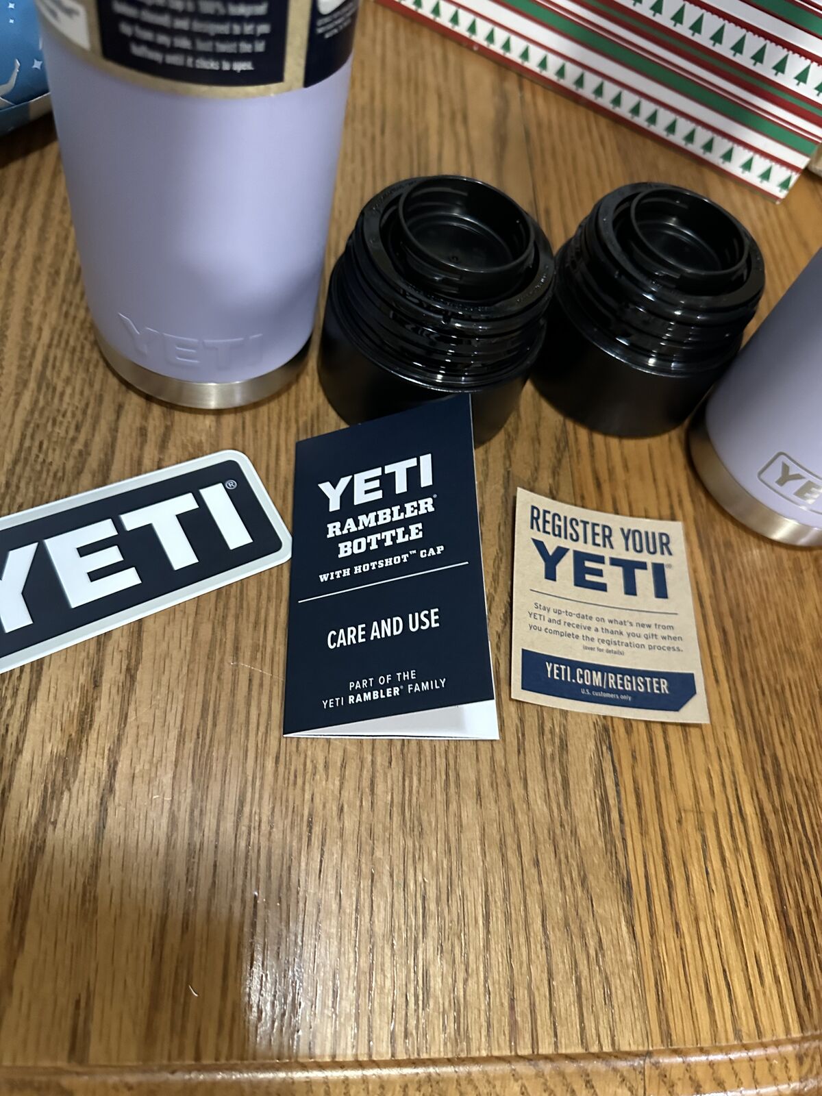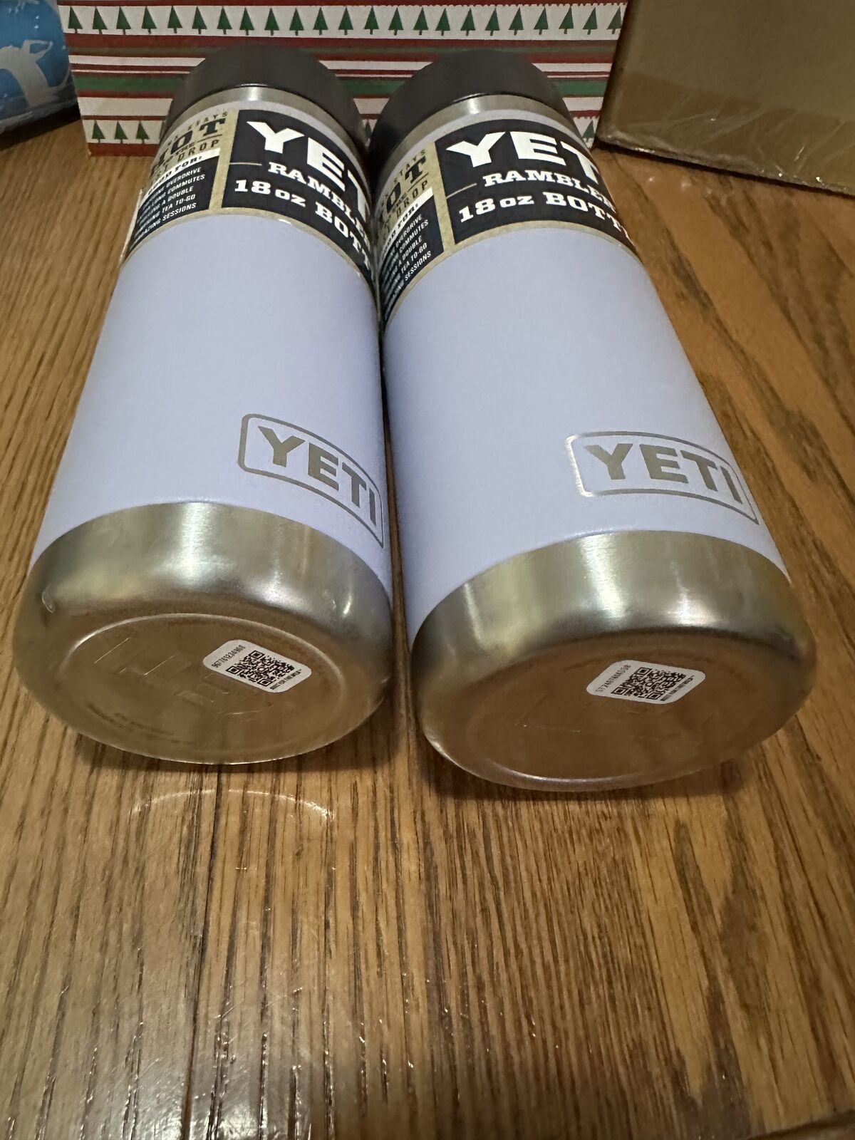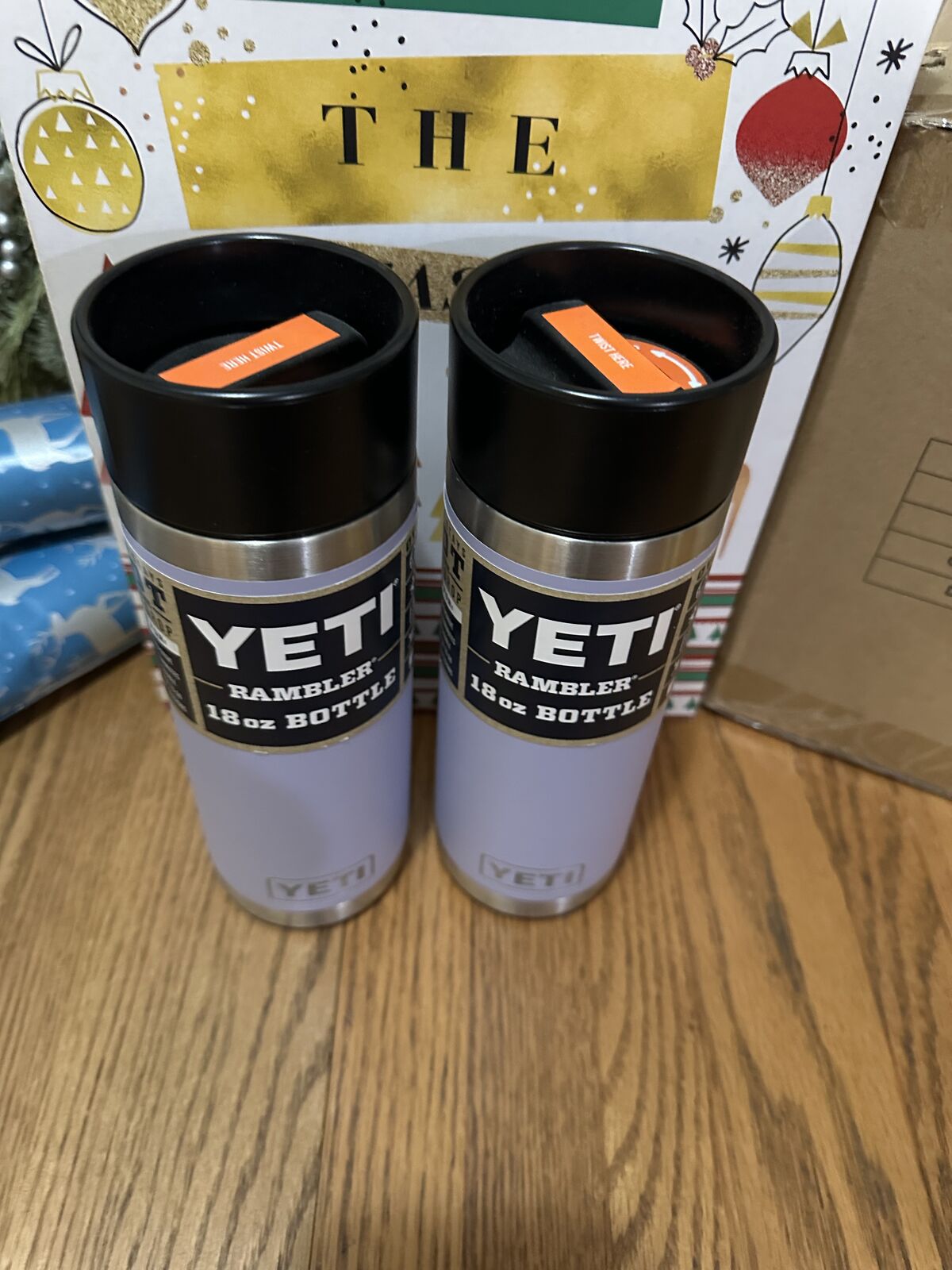 Brand new (Qty-2) Yeti Rambler Hotshot bottles, stainless steel, dishwasher safe, rust resistant, and 100% leakproof. These are vacuum-insulated and recommended for hot drinks like coffee or tea, but will also keep drinks cold. The color is called sharptail taupe. These bottles sell for $30+ each online. I'm selling them both for $40. They would make a great Christmas gift.