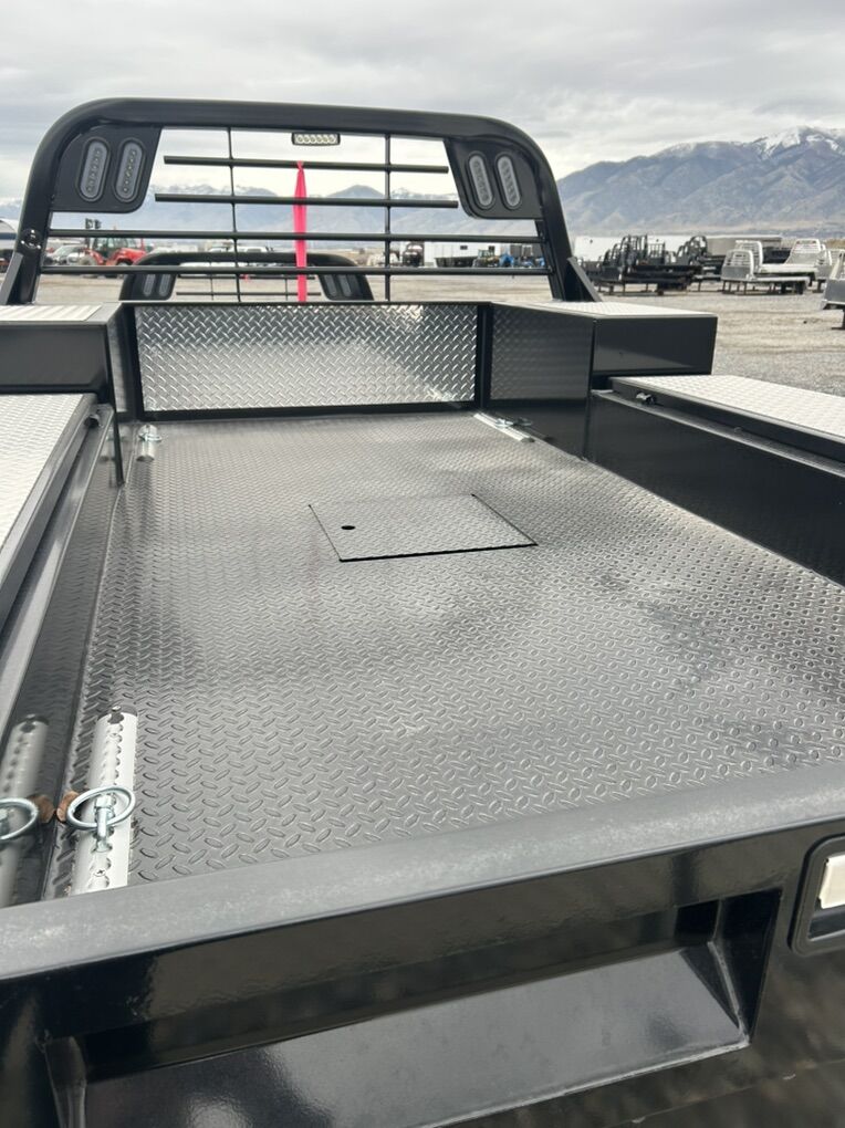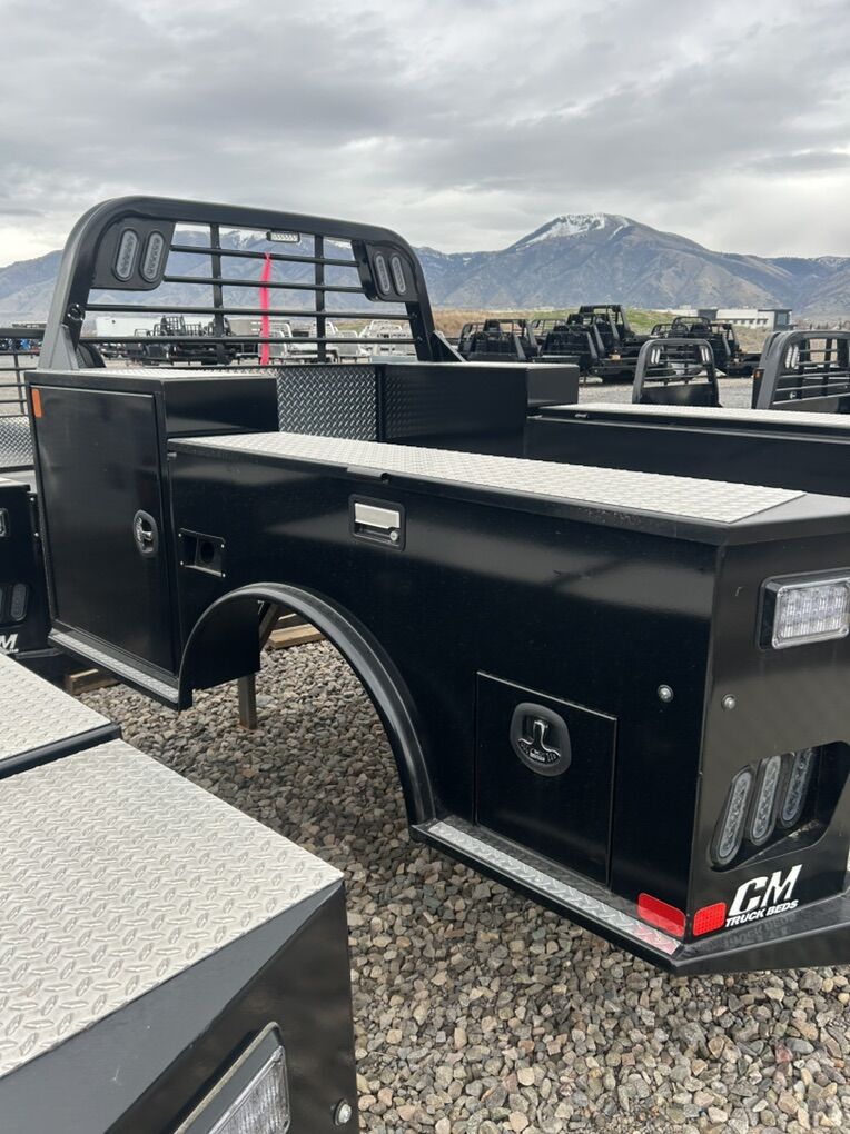 New CM TMX 7X8’6” Fits single wheel longbed Tall front boxes Long shovel top box Underbody rear box Gooseneck hitch Receiver hitch LED lights Work lights