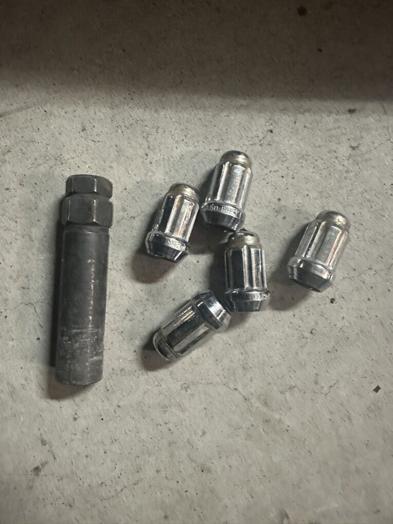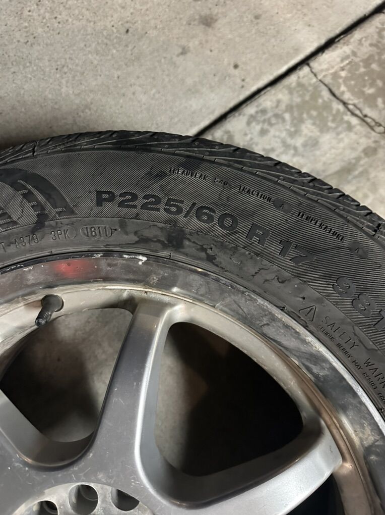 Venmo225/60R17 Wheel and Tire with Lug Nuts And Key. This tire was used as a spare tire. It has 2 lug patterns the big one is 5x4.5” the small one is 5x4”. It comes with 5 slotted lug nuts and the key. The tread is in great shape.