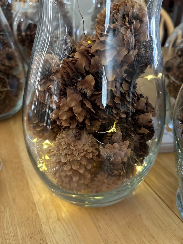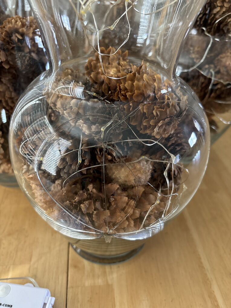 VenmoEight large glass vases filled with pinecones and strings of white LED lights with eight settings. Perfect decoration for Christmas/holiday parties, weddings, etc. One of the vases cracked and has been glued.