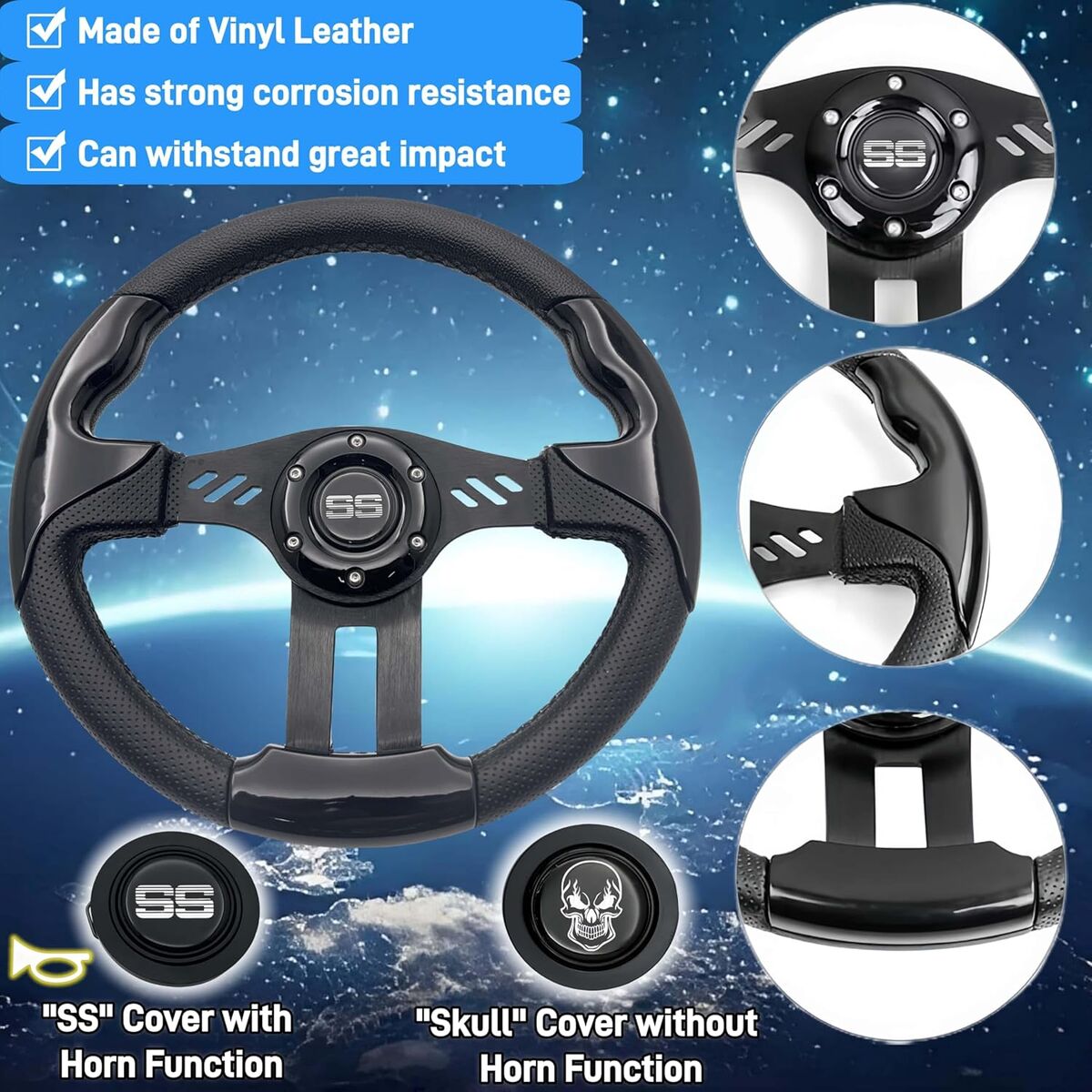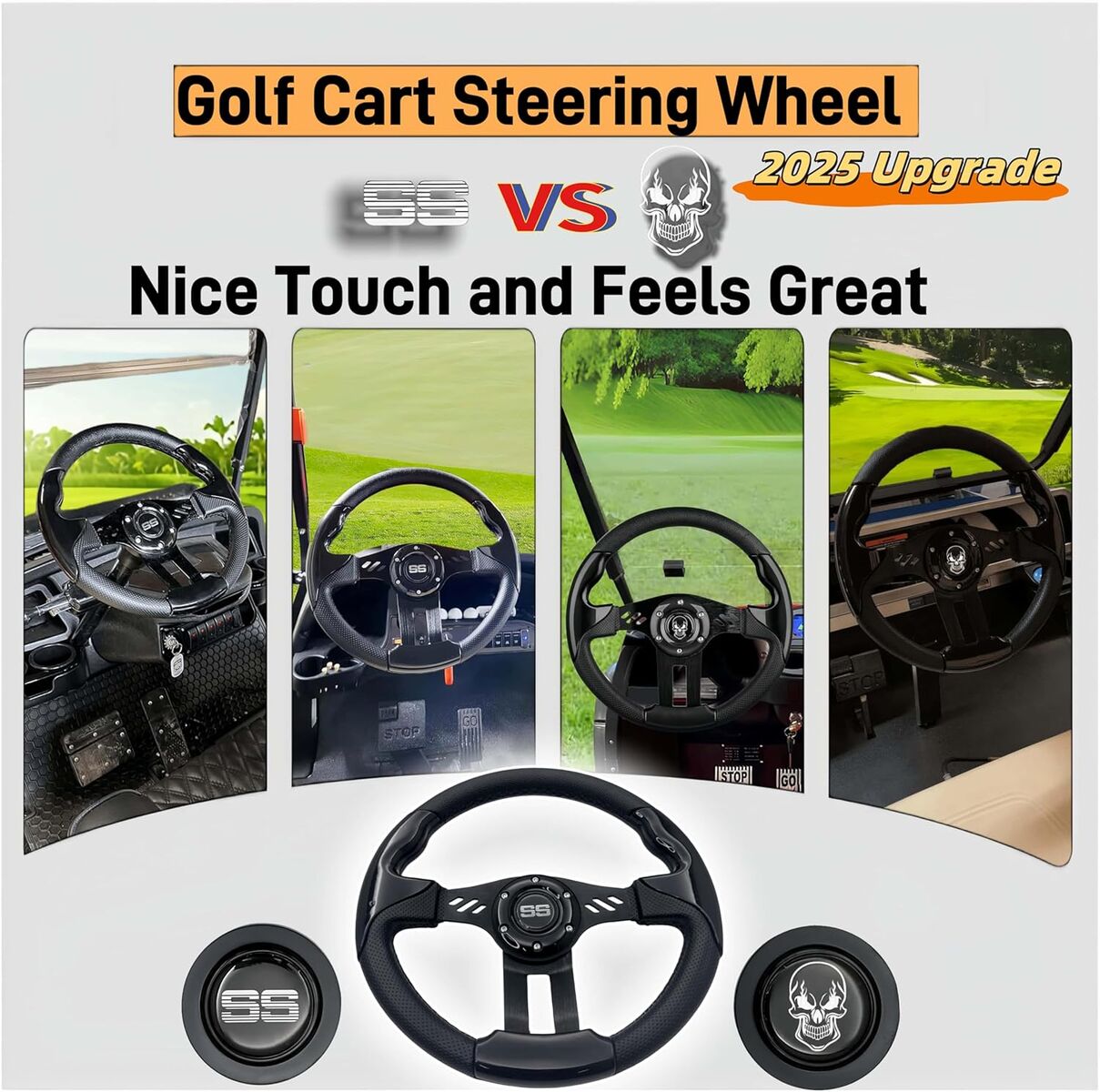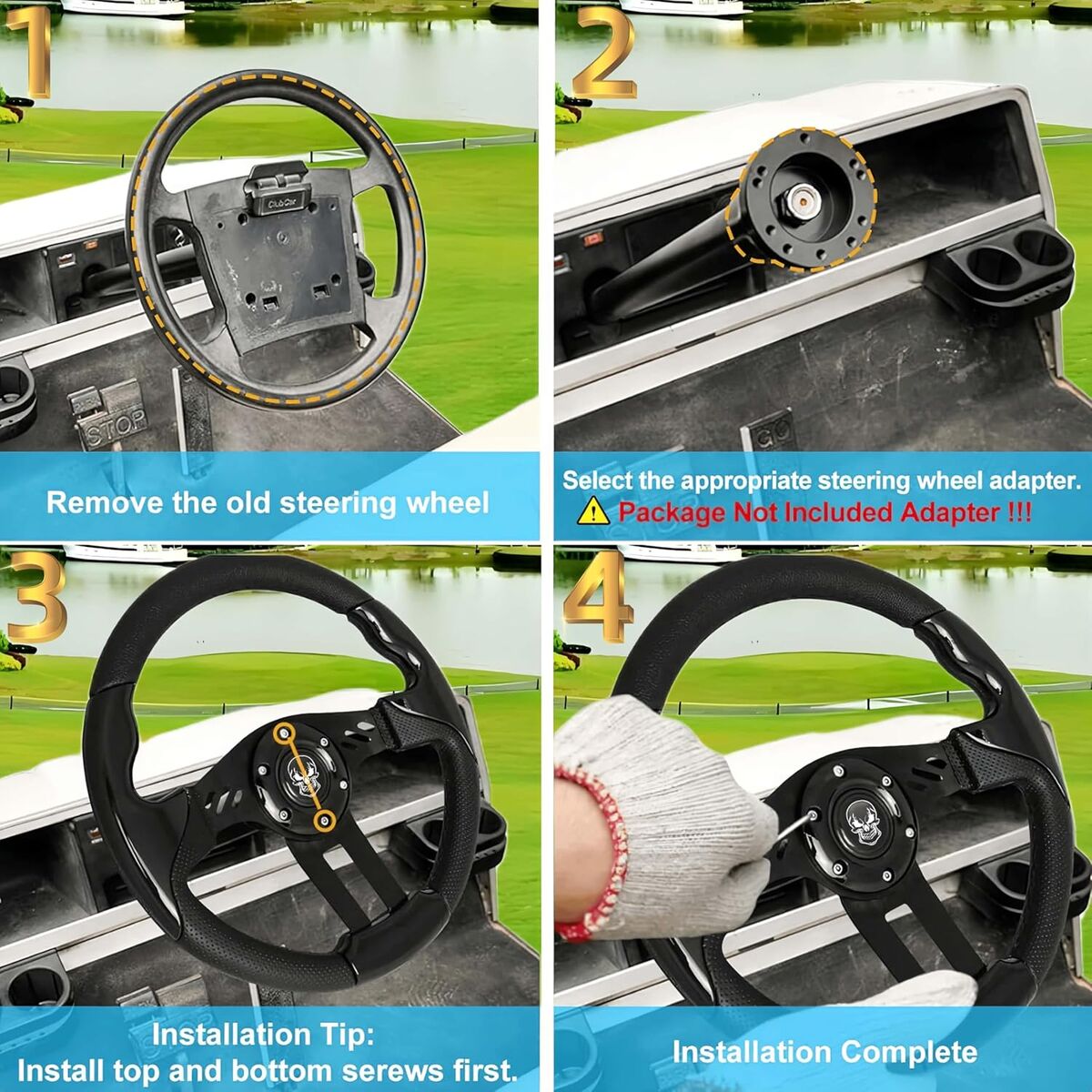 About this item - Universal Fit & Premium Build: Features a 12.5-inch luxury stylish golf cart steering wheel designed to fit Yamaha, EZGO, Club Car, and most market models. Crafted with a premium PVC cover and an aerospace-grade aluminum core, it resists UV damage, corrosion, and remains cool in high temperatures. Note: Adapter sold separately (compatible with WUKO-HUNT adapter).