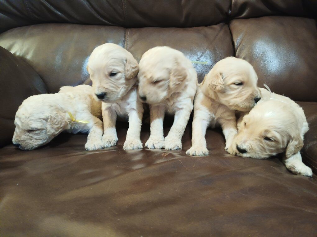 Griz had 9 beautiful F1b Goldendoodle pups on December 5th! 5 cream boys, 3 black girls, and 1 cream girl. They can be claimed with a $200 deposit. Ready for homes January 30th.