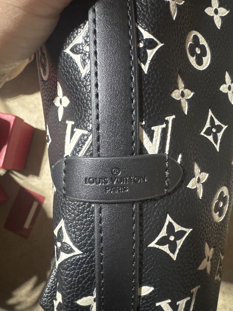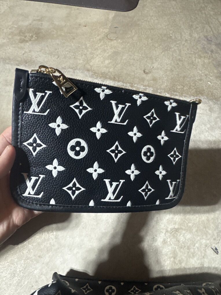 Black with white LV logo. Comes with smaller bag inside too.