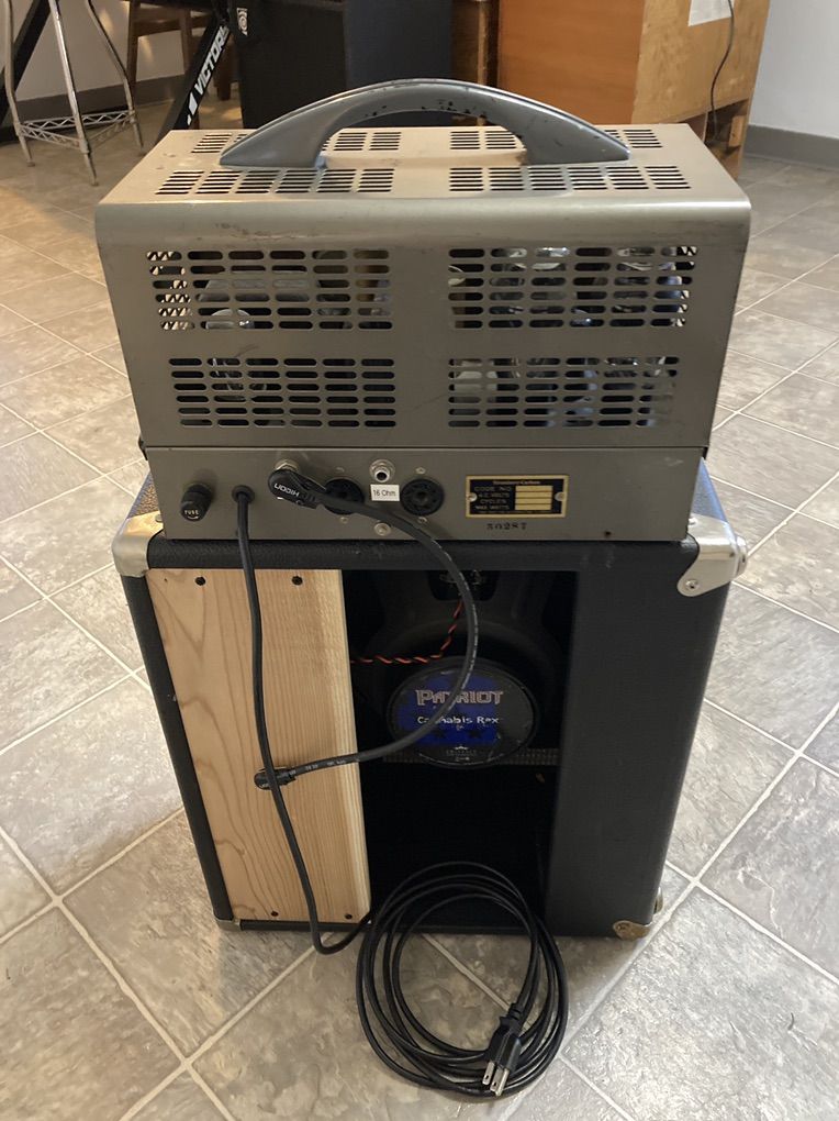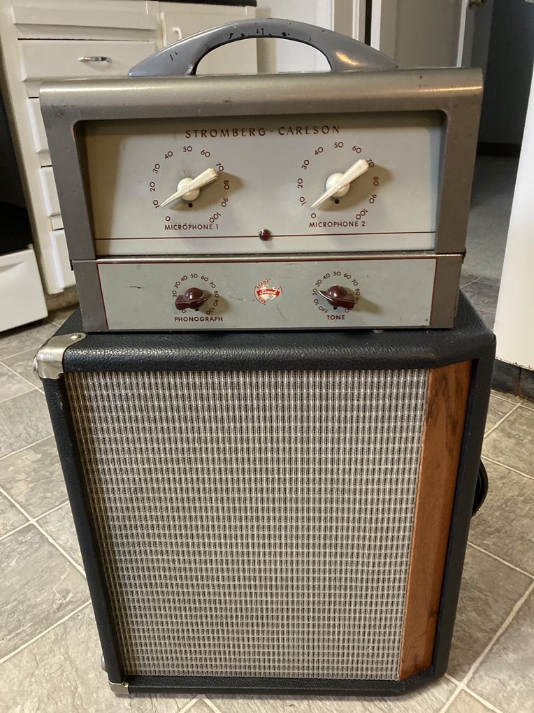 This 1951 metal lunchbox PA head is possessed; or, possesses early tweed baseman, (dressed up for the square dance)“style” cleans & some loud headroom till noon, minus the low gain inputs fender often used until 1959. It’s been owned by & rebuilt by guitarists. It’s a post war pre hi-fi. Ready for decades of viability, This hand built PA, will deliver the goods; vocals & many instruments would work here. Harmonica players recommend them. Keyboards, & pedals. 2x 1/4 inch high impedance inputs. 105 db gain at input. Interactive channel volume & treble tone control. A heathy amount of negative feedback. 8 & 16 ohms output. A 4 ohm tap exists. Phono input could become a Bluetooth / auxiliary in, is possible mod. Single wide range treble tone control, FR. 75- 10,00 cycles w/ in +0 db, - 3 db. 15 of the loudest watts, from the get go, that I’ve ever heard from any amp. It’s Locally notorious as such! Factory advertised at 15 usable watts, l it’s probably closer to 25. It has seen a near complete recap from the original two prong & death cap. Owned & serviced by the local music store’s in house Tech team!! Some more advertising from the company brochure online. 19 lbs. 1 6J5, 2 65C7, 2 6L6G, 1 5Y3G. Fixed bias. 50 watt OT. Glacier grey over copper plate housing. Lots of hand wired bells & whistles. I am second owner since re-build, spring of 2023. I’ve purchased & am selling bc I have the similarly rebuilt Au-33 model & have been very interested to learn more about these platforms! I have a 12” 8 ohm 50 watt Eminence C Rex hemp speaker inside of a re- purposed cab. Combine the two for a total of $420 !! It seems to be a safe way to play at a lower volume setting. It will be loud, but within amps 15 “useable” watts zone! Lol, if raising volume anywhere above 3 to near noon, a better match may look like an 80-120 watt 2/12” or 4/12” speaker cab set up with this beastly Mesa Boogie loud Stromberg Carlson amp. Speaker cable included with amp. I’d meet on Wasatch front for the right buyer!