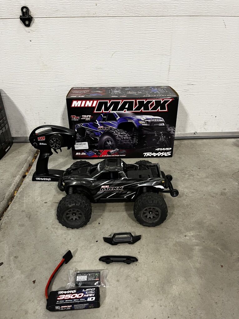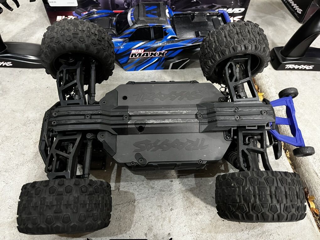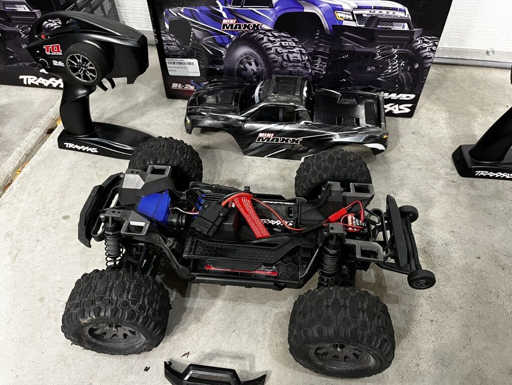 Both Mini Maxx vehicles include the stock Traxxas batteries and charger. They are equipped with light kits and will also include the original bumpers. The blue Mini Maxx additionally has body protectors installed.