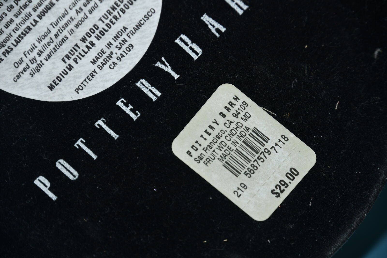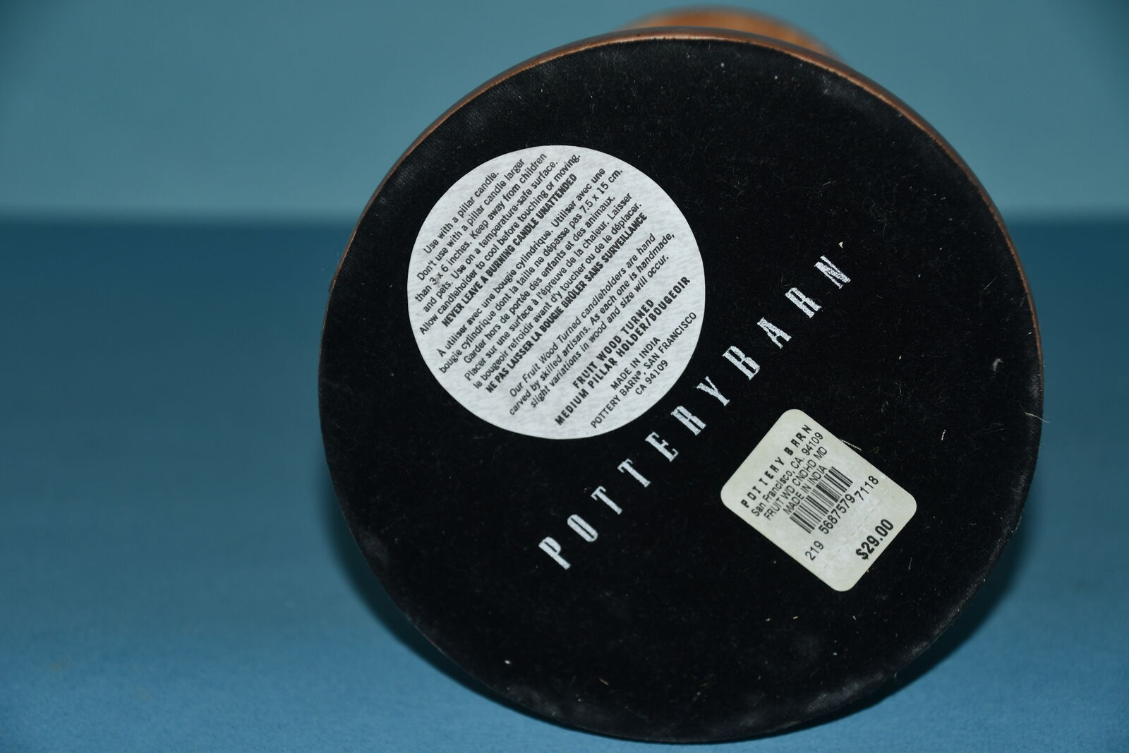 This POTTERY BARN "FRUIT WOOD" CANDLE HOLDER is about 11" in HEIGHT. It holds a 3" CANDLE. Our home is smoke free. Questions??? Please ask. We are located in Plain City. Cash only please.