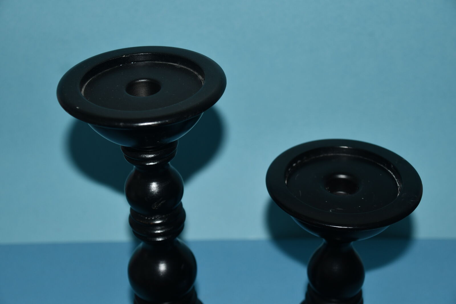 This Set of 2 "WORLD MARKET" BLACK CANDLE HOLDERS are 9" & 12" in height. They hold TAPER or PILLAR CANDLES. Our home is smoke free. Questions??? Please ask. We are located in Plain City. Cash only please.