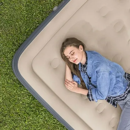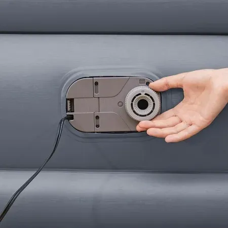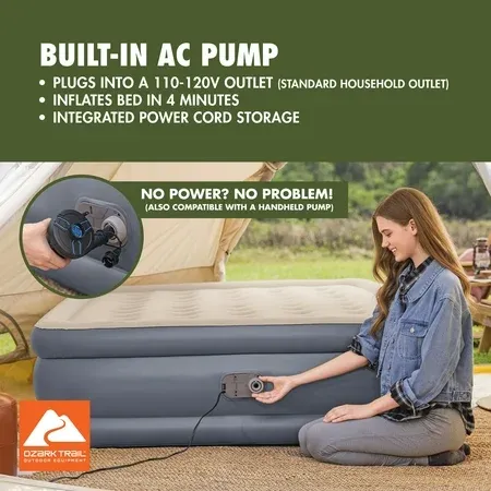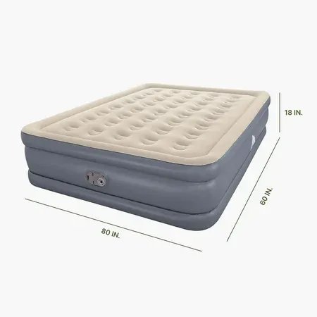 BUILT-IN AC PUMP: Automatically inflates the airbed in 5 minutes; Features an automatic deflation mode for easy and convenient set-up and take-down; Plugs into a household outlet STURDY CONSTRUCTION: Surrounding frame design prevents roll-off and increases stability COMFORTABLE COIL BEAMS: Similar construction to a traditional mattress, bringing you familiar comfort QUEEN AIR MATTRESS: 80 in. x 60 in. x 18 in. (2.03 m x 1.52 m x 46 cm) inflatable air mattress comfortably fits up to 2 adults, with a weight capacity of 661 lbs (300 kg)