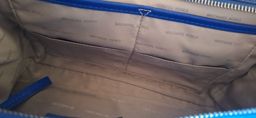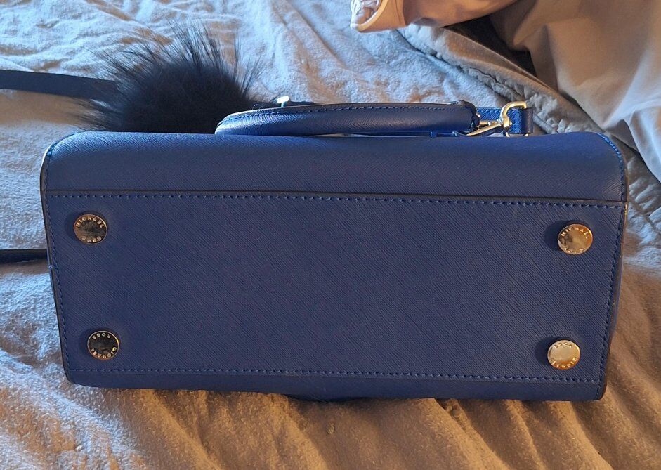 This is a Michael Kors Selma medium satchel purse in a blue saffiano leather. It features gold-tone hardware, a top-zip closure, dual top handles, and an adjustable, detachable crossbody strap.