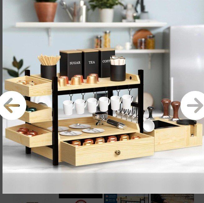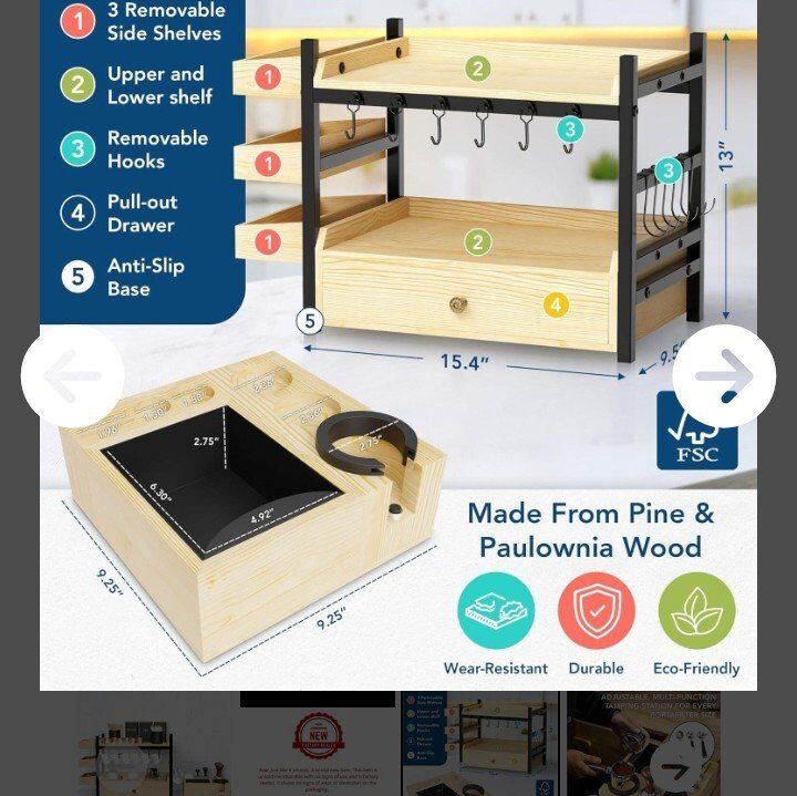 VenmoMAKE ESPRESSO WITHOUT DELAYS with the Kalei-Do-Scope Espresso Kit Tools. There s a spot in this espresso tamp station for your tamper, portafilter, espresso puck screen & stirrer. Used coffee pucks? Drop them in the removable bin for quick cleanups HIDE THE MESS and stay organized using the drawer built right into the espresso organizer station. Whether you re a coffee lover with too many tools or someone who wants to keep things neat, this coffee tamper station bar gives you space to tuck it all away TIDY UP YOUR COFFEE BAR by hanging your mugs on the 6 square hooks, placing coffee beans, syrups, or filters on the 3 shelves, and using the 6 magnetic hooks for quick-access tools. Now focus on enjoying your morning routine with this all-in-one espresso tool kit ADD RUSTIC TOUCH to your kitchen or office nook with our espresso accessories kit. The natural look of pine and paulownia wood gives your space a warm feel, while the iron frame of this espresso station organizer holds all your gear without wobbling or bending over time KEEP IT LOOKING FRESH so your coffee tamping station is always ready to impress.