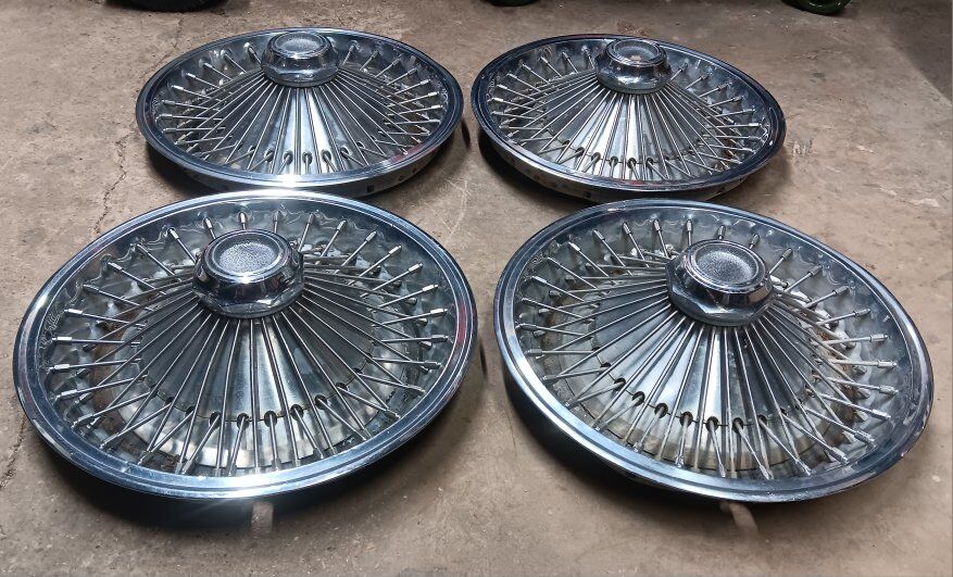 1970-1978 Dodge Chrysler Plymouth Magnum Charger Cordoba 14" Wire Spoked Hubcaps. Used OEM Chrysler Hubcaps in Decent Condition.