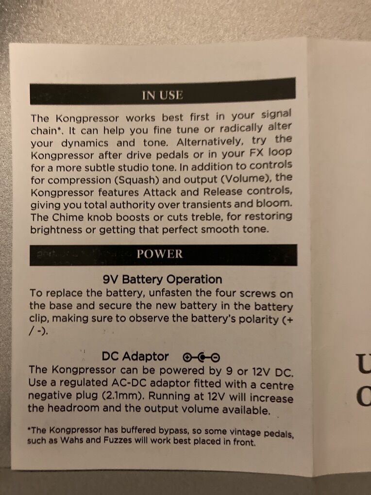 It’s based on a classic studio Vactrol VTL5C3 Optocoupler design. Squeezers. Soft musical compression. 12 db. Clean boost. Ramps 18 volt internal power 9v Battery & wall power. A workhorse with low use. Great price.