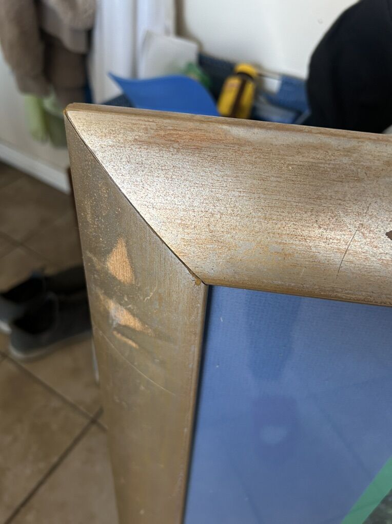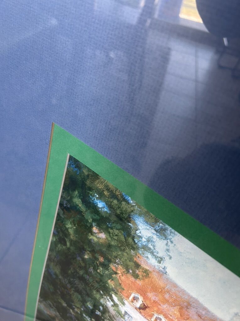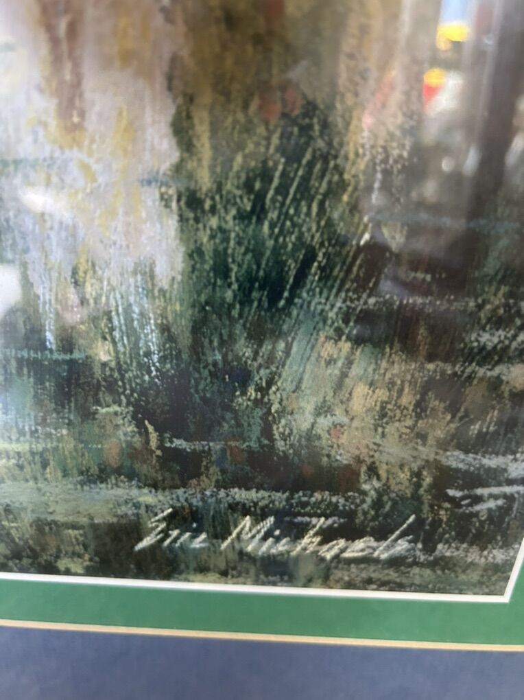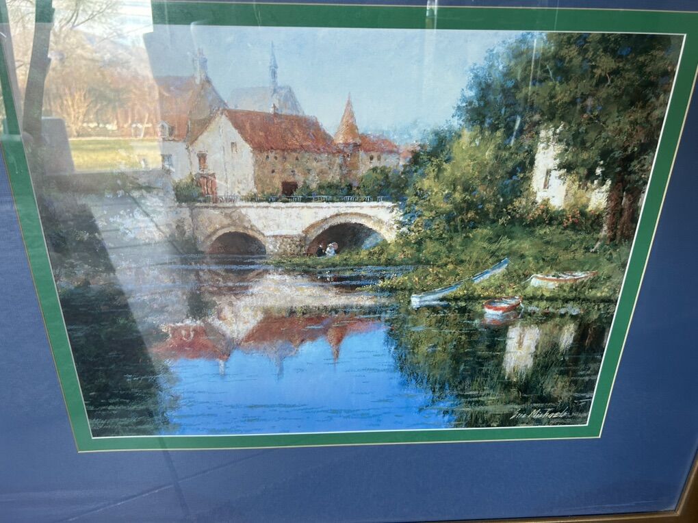 VenmoFramed art print titled Picnic in Chablis by listed artist Eric Michaels. Eric Michaels is known for his landscape paintings, often featuring charming scenes of Europe. The painting depicts a picturesque scene of a building with a red-tiled roof and an arched bridge over a river. Measures 40x35, Cash or Venmo only.