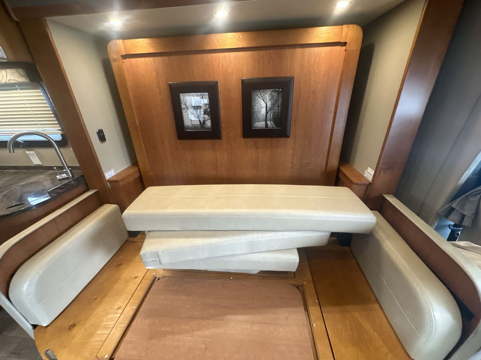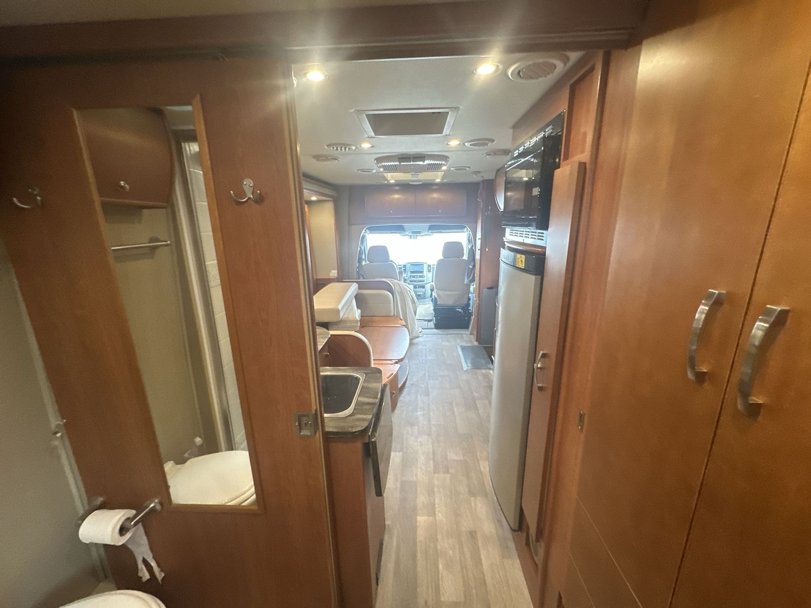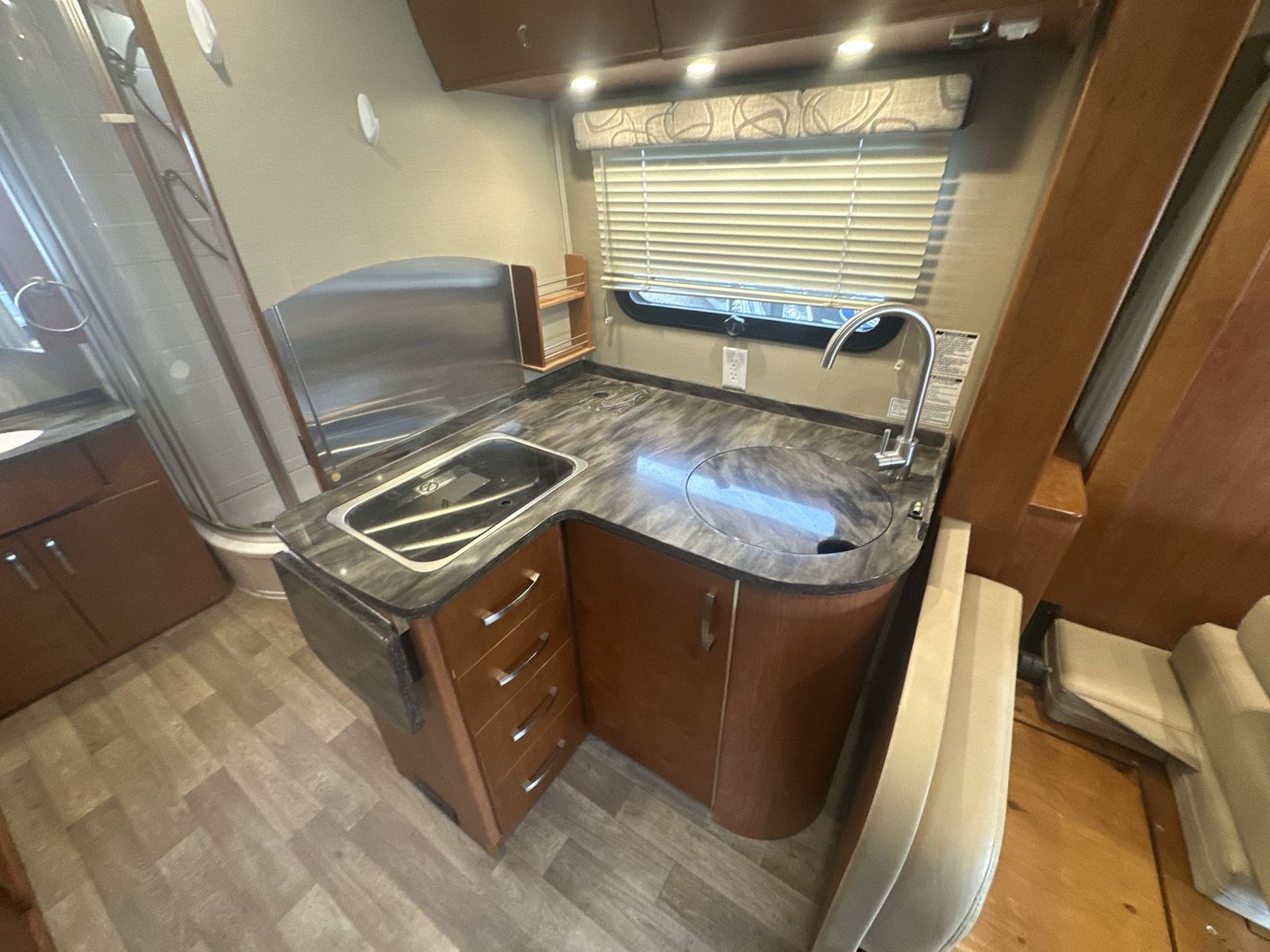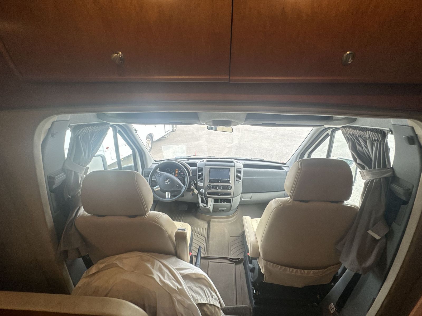 This Leisure Travel class B+ diesel unit 24MB offers a single slide out with queen size Murphy bed included, a pop-up 32" LED TV, curved European cabinetry throughout, and a bathroom that will make any class A owner envious. Step inside and notice two lounge chairs straight ahead with a table between the two. The driver and passenger cab seats also swivel to create more of a conversation area. At night lower the Murphy bed down to create a comfortable space to sleep. In the kitchen area find a round sink, a two burner range top, counter extension, plus upper and lower cupboards and cabinets for storage. There is a refrigerator opposite, and a pull-out pantry for even more storage for canned and dry goods. The pop-up 32" LED TV is located just inside the door to the left for your viewing pleasure. Head to the back where you will find a storage wardrobe for hanging clothes, and a spacious bathroom area including a toilet with overhead storage, a corner shower, and a sink with medicine cabinet above, plus so much more!