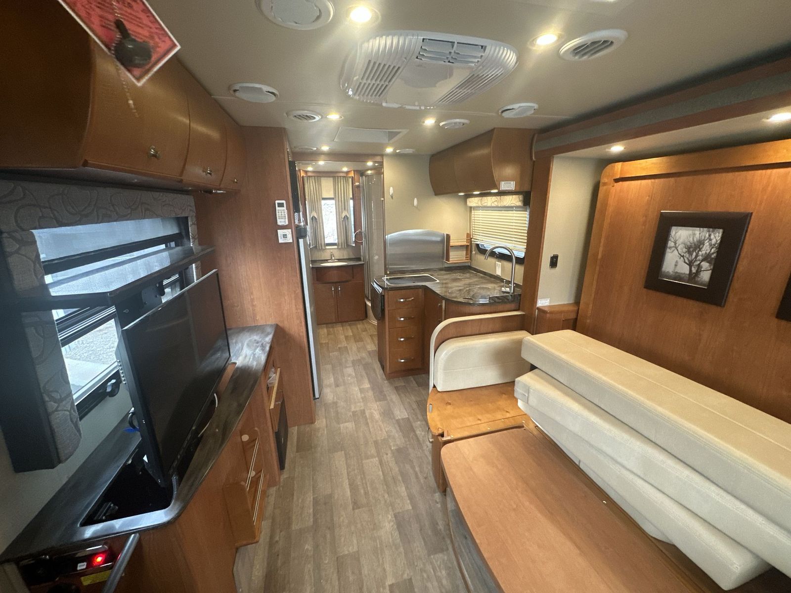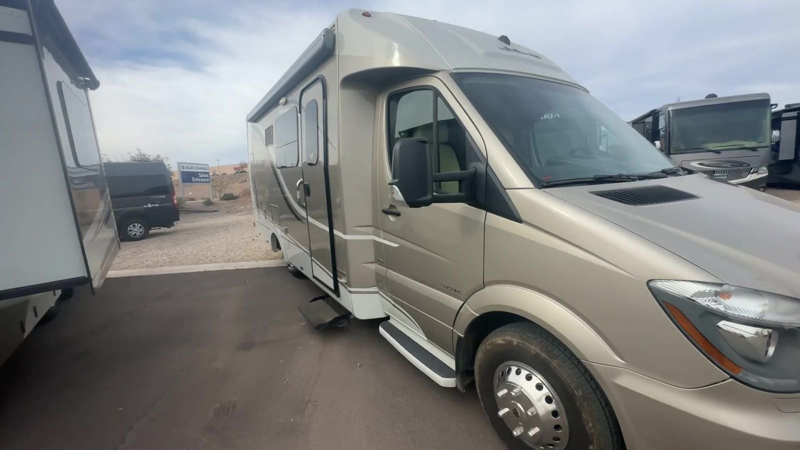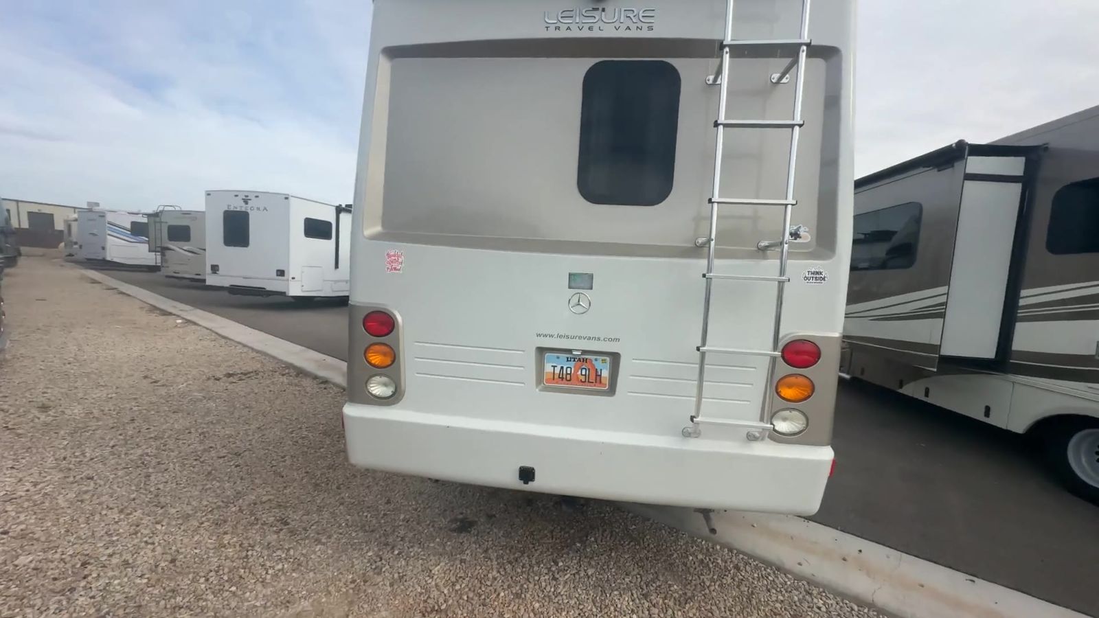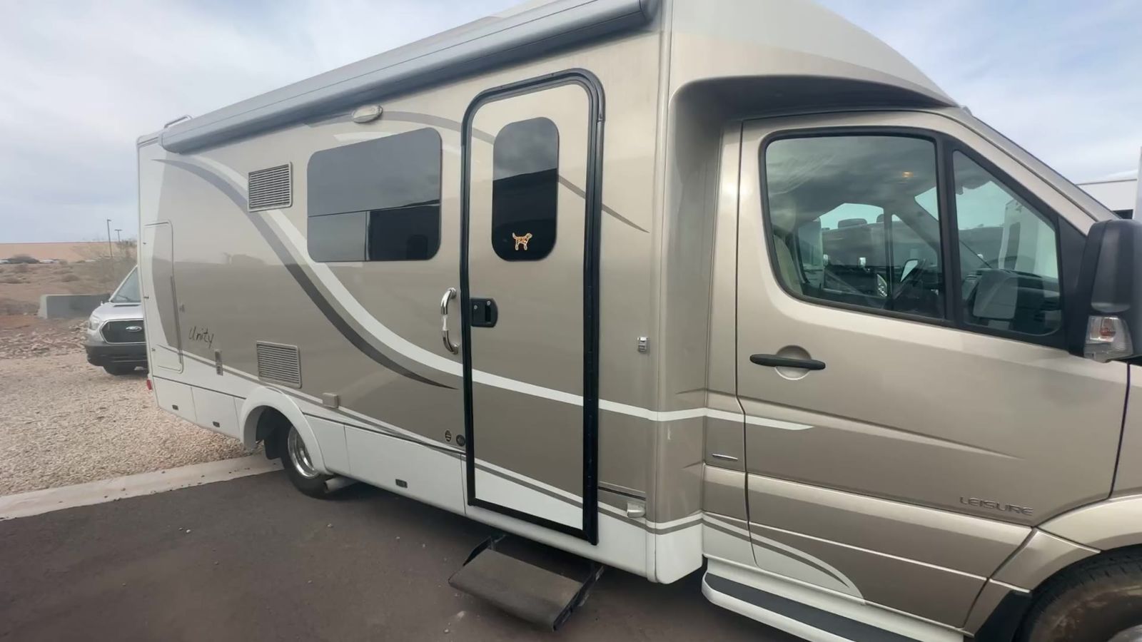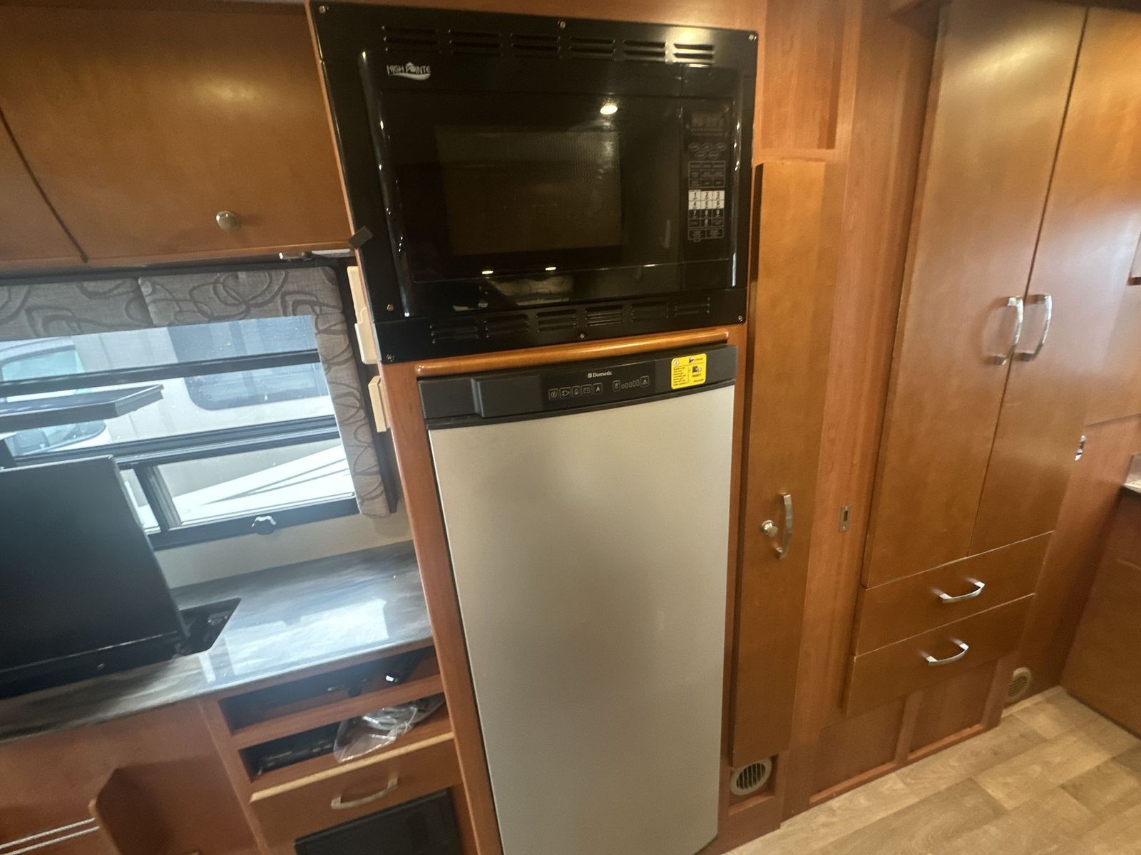 This Leisure Travel class B+ diesel unit 24MB offers a single slide out with queen size Murphy bed included, a pop-up 32" LED TV, curved European cabinetry throughout, and a bathroom that will make any class A owner envious. Step inside and notice two lounge chairs straight ahead with a table between the two. The driver and passenger cab seats also swivel to create more of a conversation area. At night lower the Murphy bed down to create a comfortable space to sleep. In the kitchen area find a round sink, a two burner range top, counter extension, plus upper and lower cupboards and cabinets for storage. There is a refrigerator opposite, and a pull-out pantry for even more storage for canned and dry goods. The pop-up 32" LED TV is located just inside the door to the left for your viewing pleasure. Head to the back where you will find a storage wardrobe for hanging clothes, and a spacious bathroom area including a toilet with overhead storage, a corner shower, and a sink with medicine cabinet above, plus so much more!