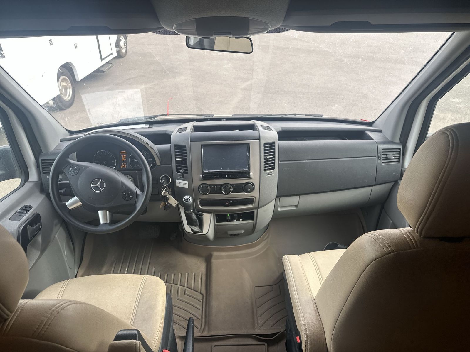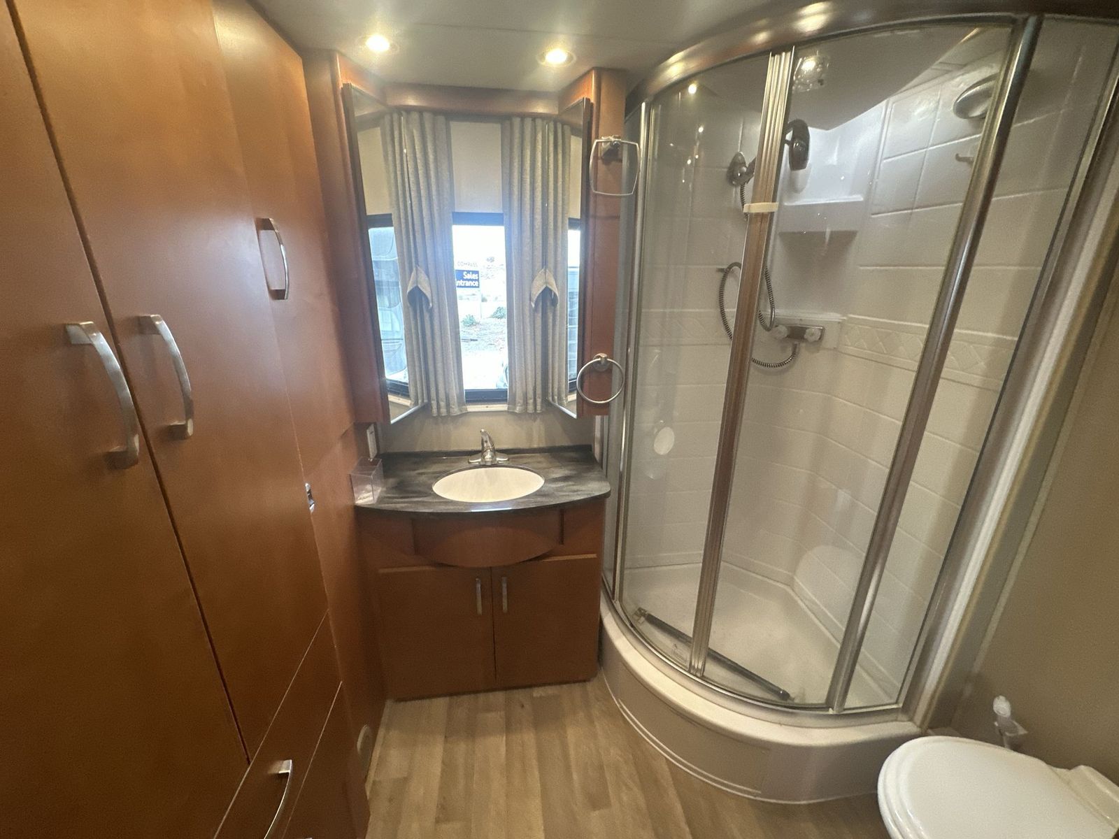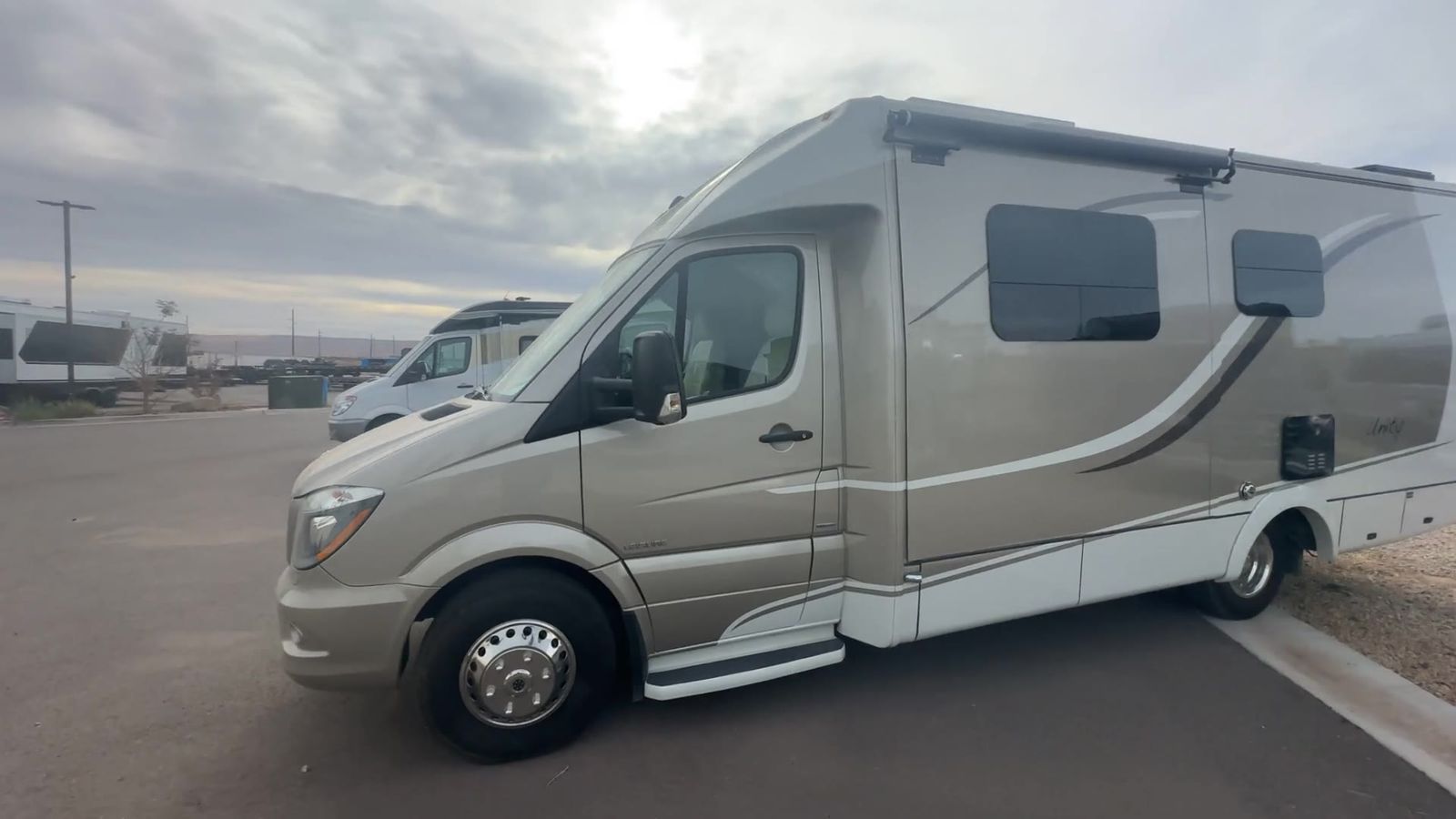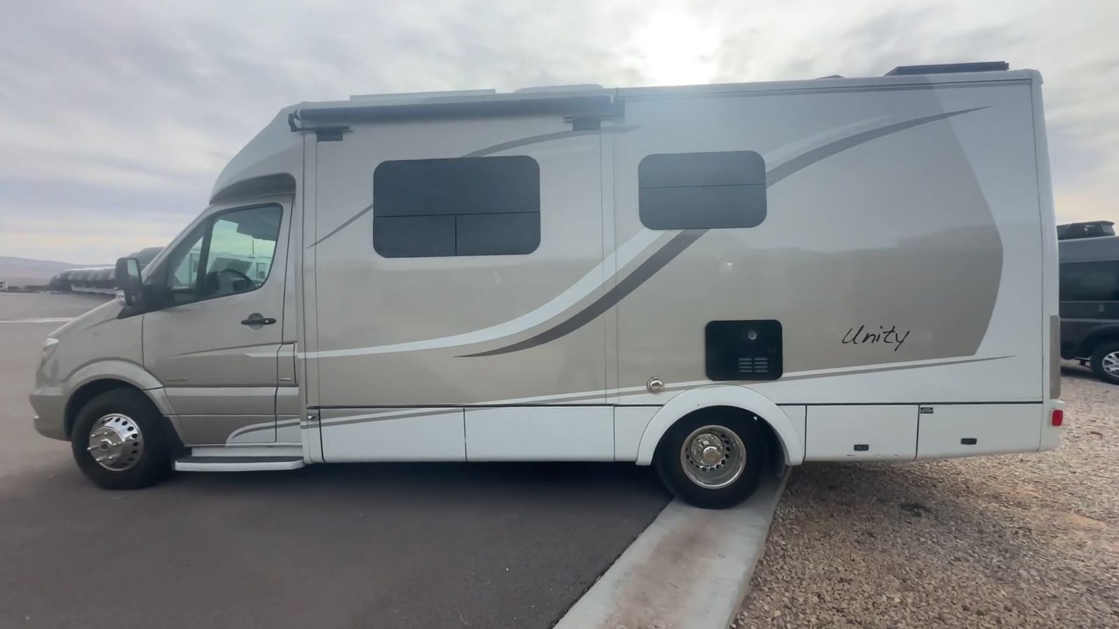 This Leisure Travel class B+ diesel unit 24MB offers a single slide out with queen size Murphy bed included, a pop-up 32" LED TV, curved European cabinetry throughout, and a bathroom that will make any class A owner envious. Step inside and notice two lounge chairs straight ahead with a table between the two. The driver and passenger cab seats also swivel to create more of a conversation area. At night lower the Murphy bed down to create a comfortable space to sleep. In the kitchen area find a round sink, a two burner range top, counter extension, plus upper and lower cupboards and cabinets for storage. There is a refrigerator opposite, and a pull-out pantry for even more storage for canned and dry goods. The pop-up 32" LED TV is located just inside the door to the left for your viewing pleasure. Head to the back where you will find a storage wardrobe for hanging clothes, and a spacious bathroom area including a toilet with overhead storage, a corner shower, and a sink with medicine cabinet above, plus so much more!
