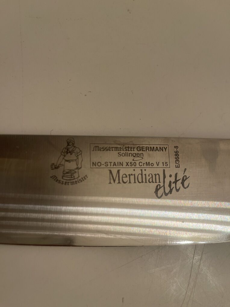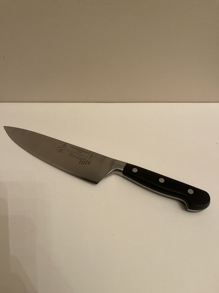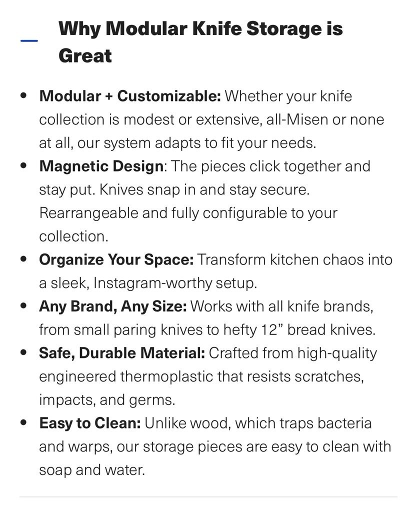 PayPalThis is a cool knife storage system by Misen. This set holds 3 large knives plus two smaller ones. The color is black. This modular knife storage system also comes with a nice 8” blade Meridian Elite chef’s knife by Messermeister. The total length of the knife is 13.5”. It’s in good condition! The knife storage system is new; the knife is used, and in good condition!