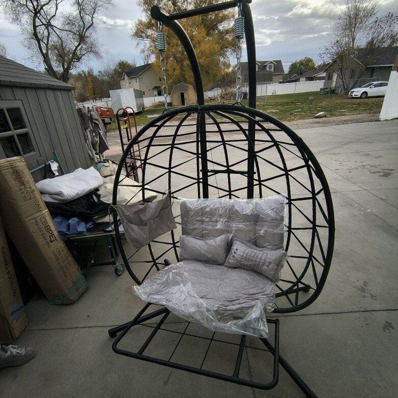 GooglePaynew double person egg swing cushions still in plastic but it's put together.