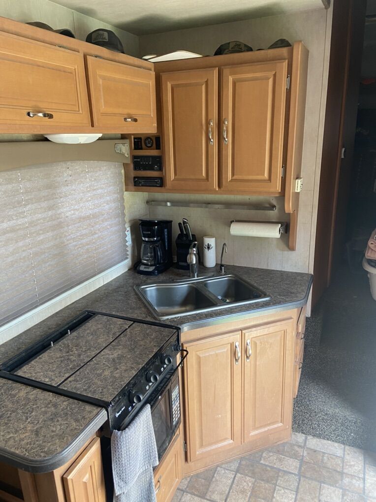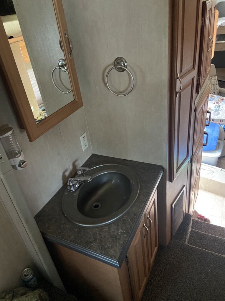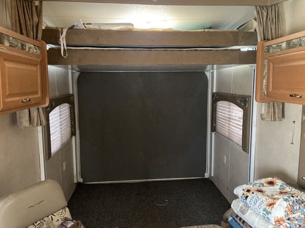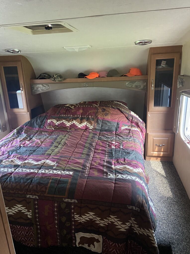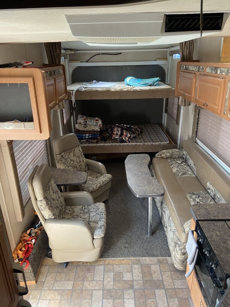 This trailer has been a great trailer. Has double bunks in the back, couch bed, queen size master bed and 2 captain chairs. Everything works great on the trailer. Only issue is a damaged fender flare due to blow out. See pics. Model SL-3005 30 foot fifth wheel