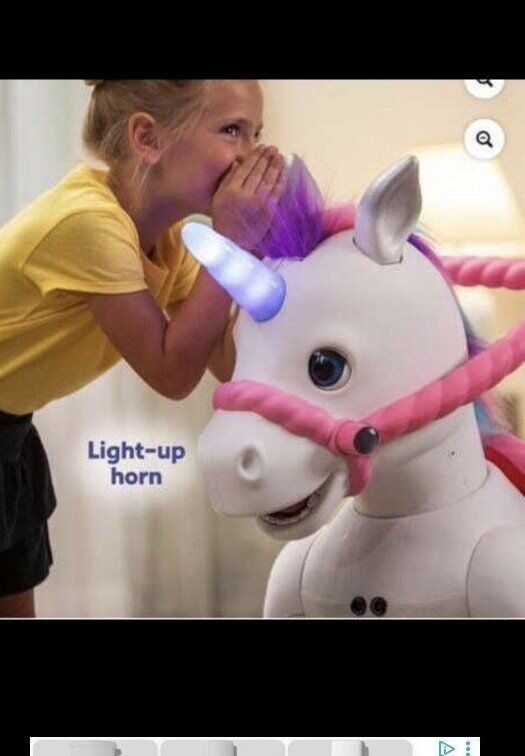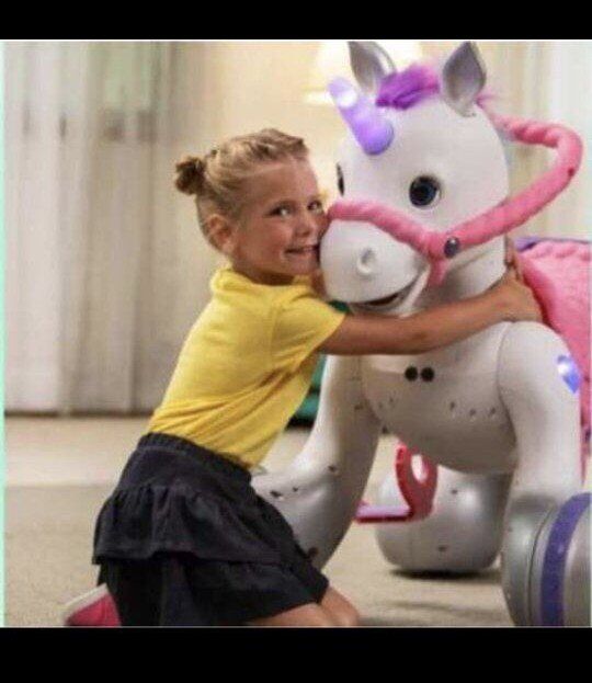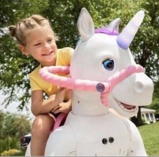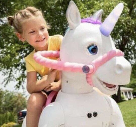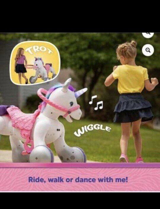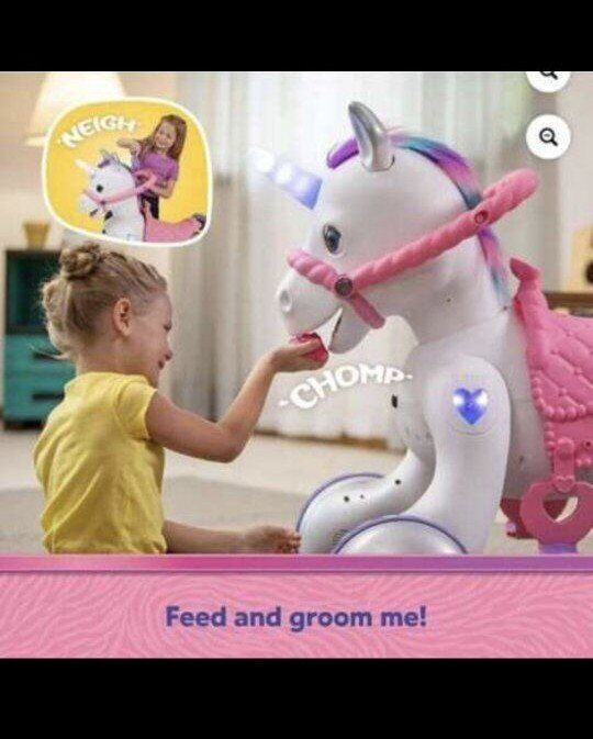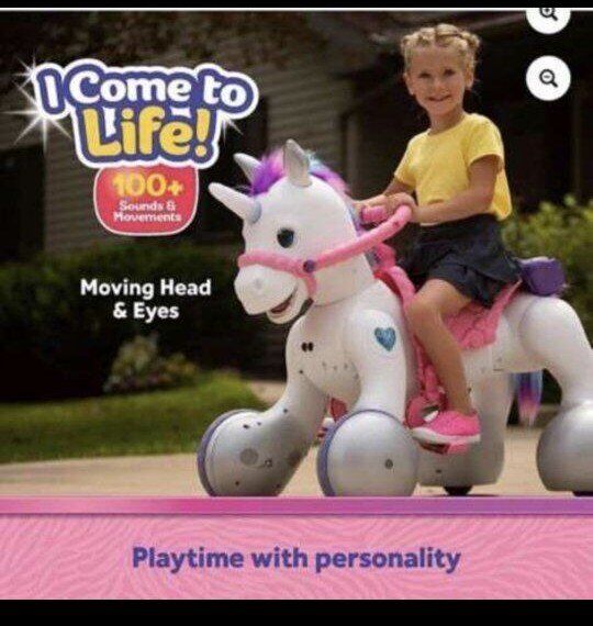This enchanting unicorn combines the fun of a battery-powered ride-on toy with real interactive play. Josie comes to life with over 100 unique sounds and movements thanks to her fully motorized eyes, ears, head, and wheels. Kids can hear munching noises as they feed Josie a tasty treat or watch her ears move as they brush her mane. They can take her for a walk, dance with her, and of course, ride their very own unicorn! Josie has two forward speeds and one reverse speed. And to make it even more magical, songs and pony sounds play as your child rides. Josie comes with a grooming brush, cupcake, flowers, and saddlebag. The included rechargeable 12-volt battery and charger ensures the fun never has to stop for long, while the One Step Direct Connect system makes it super easy to recharge. Josie will create magical memories for your family.