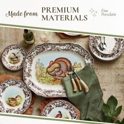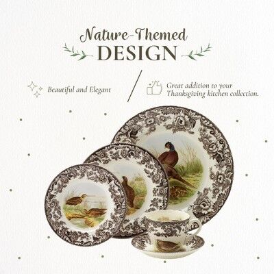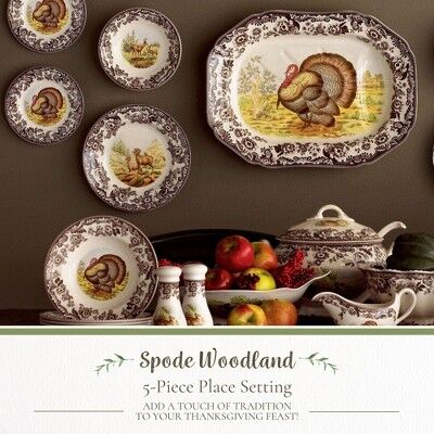 Distinctive Woodland Design: Spode's Woodland pattern brings rich autumn tones and rustic charm to your table. Pair with Delamere for a softer, elegant Thanksgiving look.