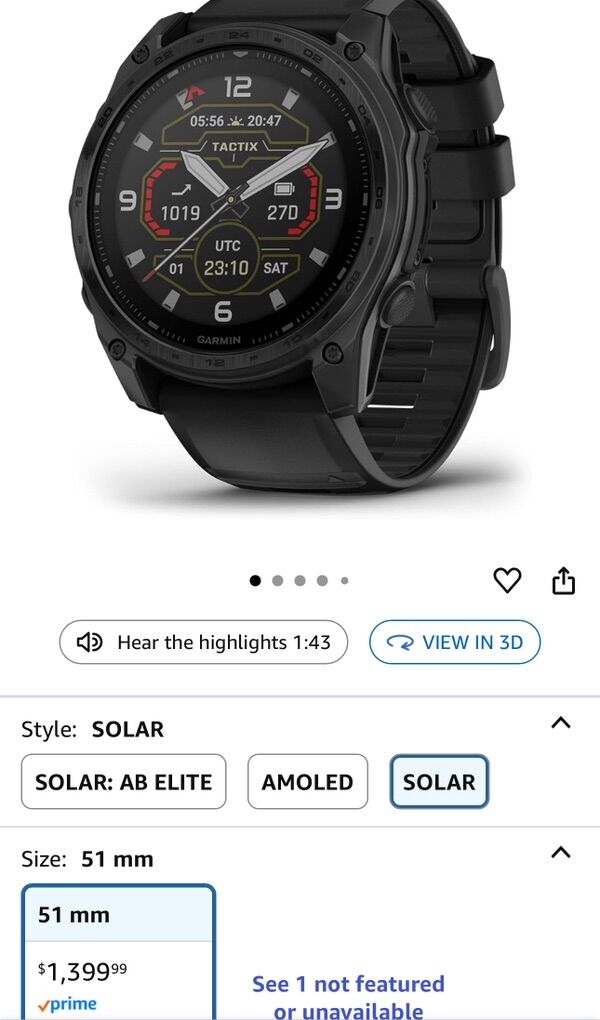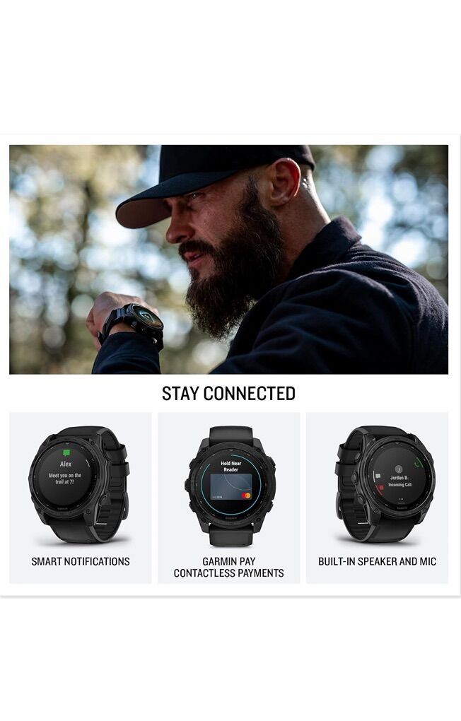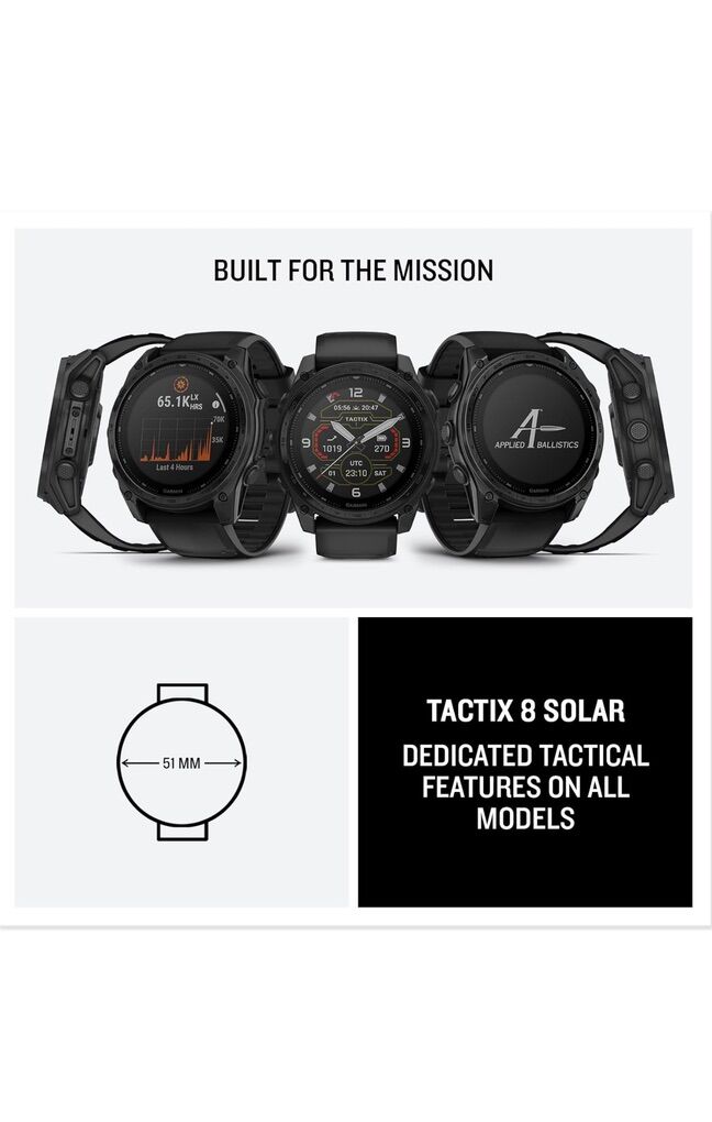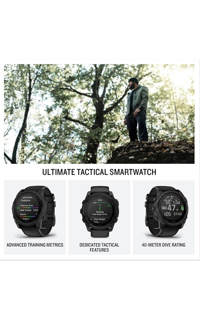 · Advanced tactical GPS smartwatch features a 1.4” solar charged display, titanium bezel and sapphire lens and built-in LED flashlight for after-dark visibility · Dedicated tactical features include a jumpmaster activity, waypoint projection, dual-position GPS format, stealth mode, kill switch, compatibility with night vision goggles, rucking activity and a preloaded Applied Ballistics solver · Download the AB Quantum mobile app on your compatible smartphone to manage profiles and targets or use your smartphone as an additional display · Power up your body’s performance, endurance and resistance to injury with targeted strength training plans, real-time stamina tracking, sport-specific workouts and a full range of built-in sports apps · Battery performance: up to 48 days in smartwatch mode with solar charging (assumes all-day wear with 3 hours per day outside in 50,000 lux conditions) and up to 149 hours in GPS mode with solar charging (assumes continuous use for entire period in 50,000 lux conditions) · Navigate the outdoors with superior positioning accuracy, thanks to multi-band GPS with SatIQ technology plus built-in sensors for the 3-axis compass, gyroscope and barometric altimeter · 40-meter dive rating helps you reach new depths with support for scuba and apnea dive activities · Includes a fully functional aviation navigation system with worldwide dynamic moving map, GPS navigation, NEXRAD, weather display, airport information and more · 24/7 health and wellness monitoring with wrist-based heart rate, advanced sleep monitoring, respiration tracking, Pulse Ox and more (this is not a medical device, and data presented is intended to be a close estimation of metrics tracked; Pulse Ox not available in all countries); the ECG app can record your heart rhythm and check for signs of atrial fibrillation (not available in all regions; for people 22 years or older) · Explore new missions with preloaded TopoActive maps with relief shading, and get access to free additional downloadable maps from around the world — plus built-in maps for thousands of golf courses and ski resorts worldwide.