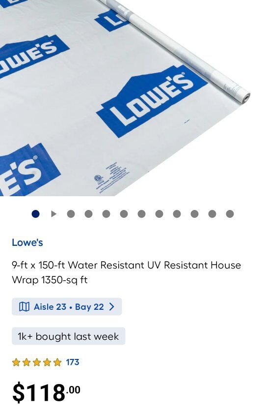 VenmoI have a few extra rolls of Lowes house wrap that I no longer need. These rolls new are $118 + tax, and I am selling them for $90 each. I have 7 available.