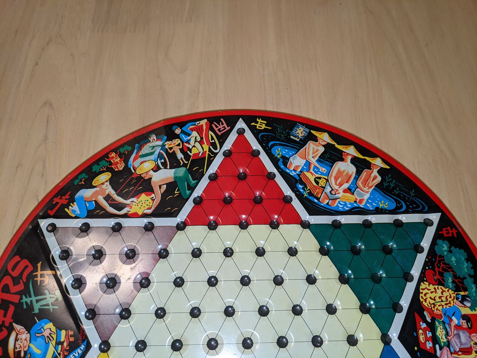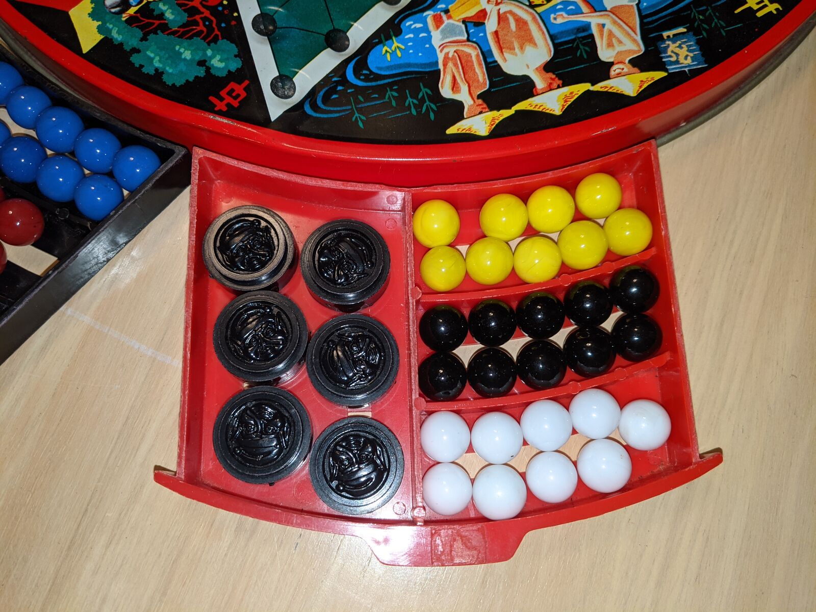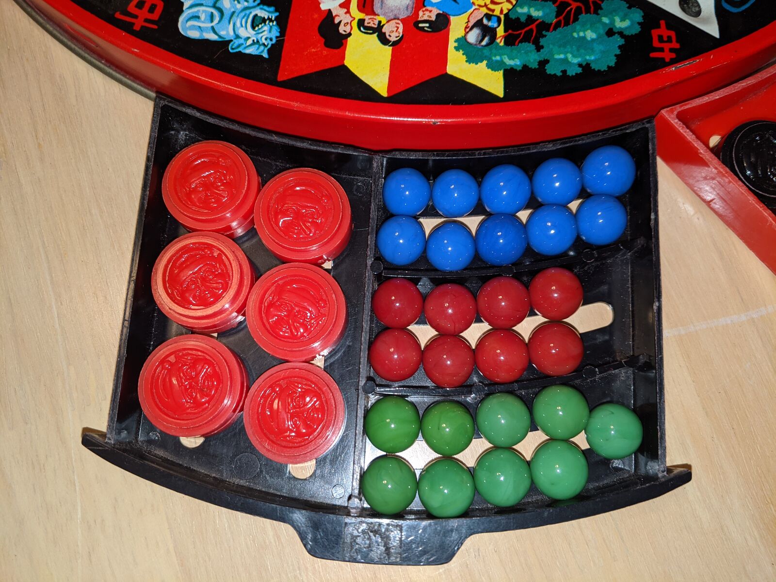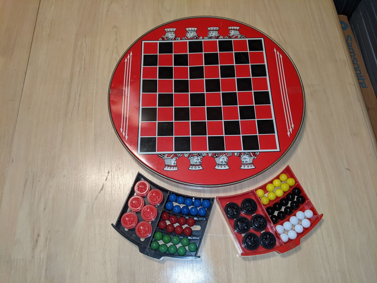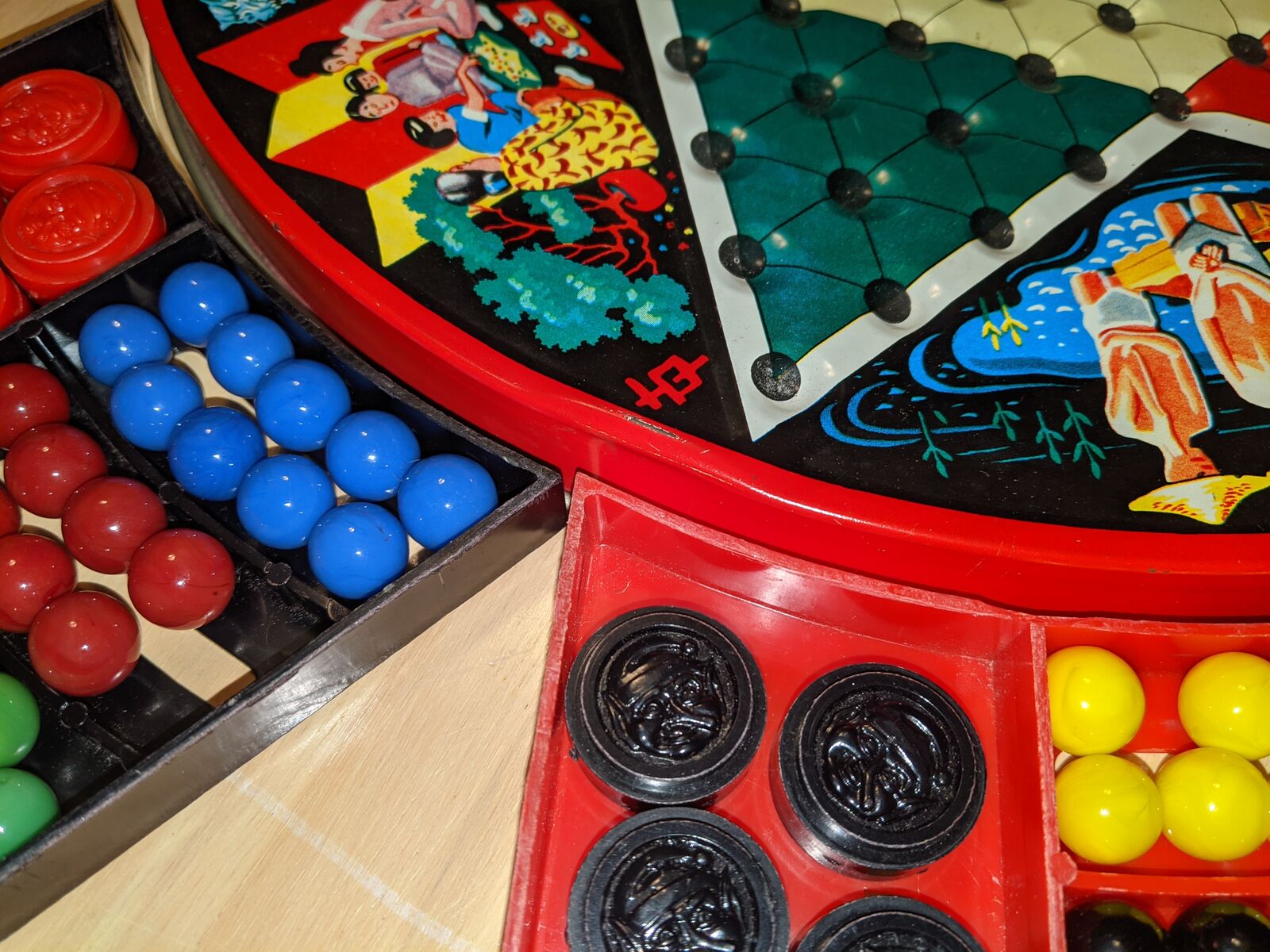 Vintage Chinese Checkers Game Tin Metal Glass Marbles Plastic Checkers. Original family owned. All checkers discs are included. Missing marbles: red-2, green-1, yelleow-1, white-1. Note corner of red drawer is broken.