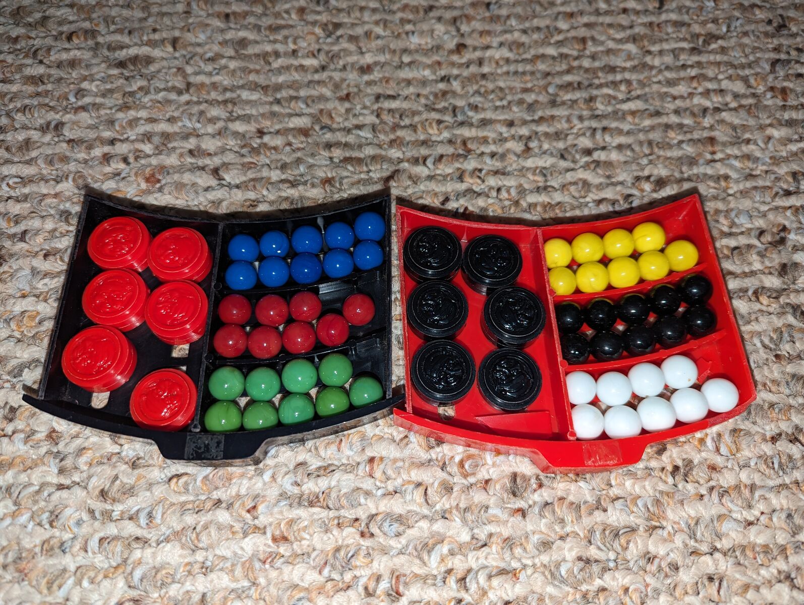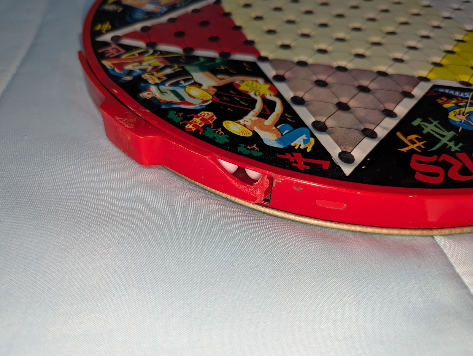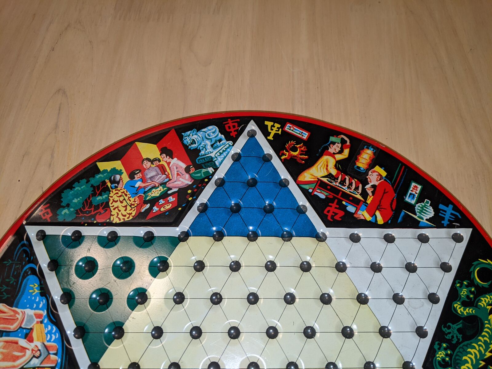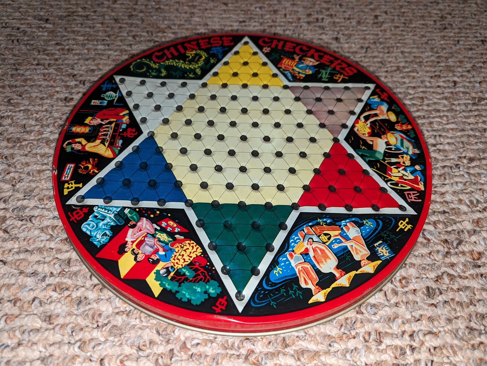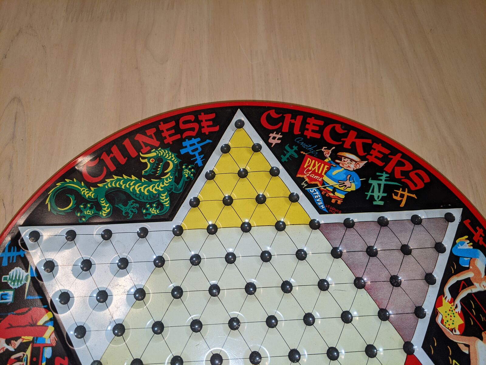 Vintage Chinese Checkers Game Tin Metal Glass Marbles Plastic Checkers. Original family owned. All checkers discs are included. Missing marbles: red-2, green-1, yelleow-1, white-1. Note corner of red drawer is broken.