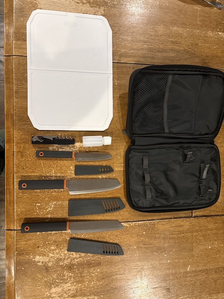 VenmoGSI Outdoors Santoku Knife Set, Compact 6-Piece Camping Chef Knife Kit with Cutting Board, Sheaths, Soap Bottle & Travel Case
