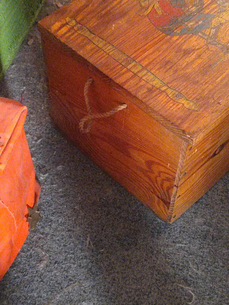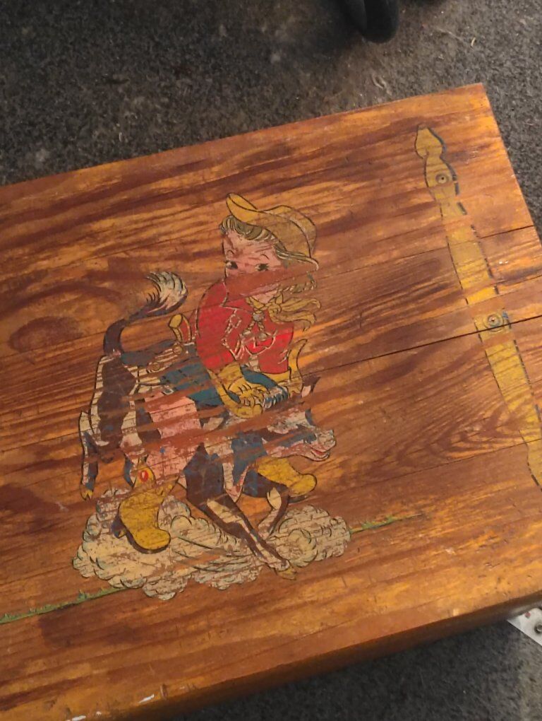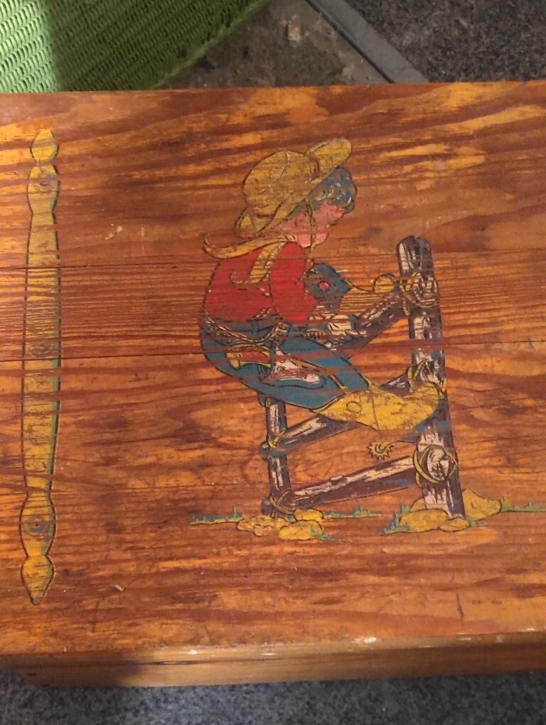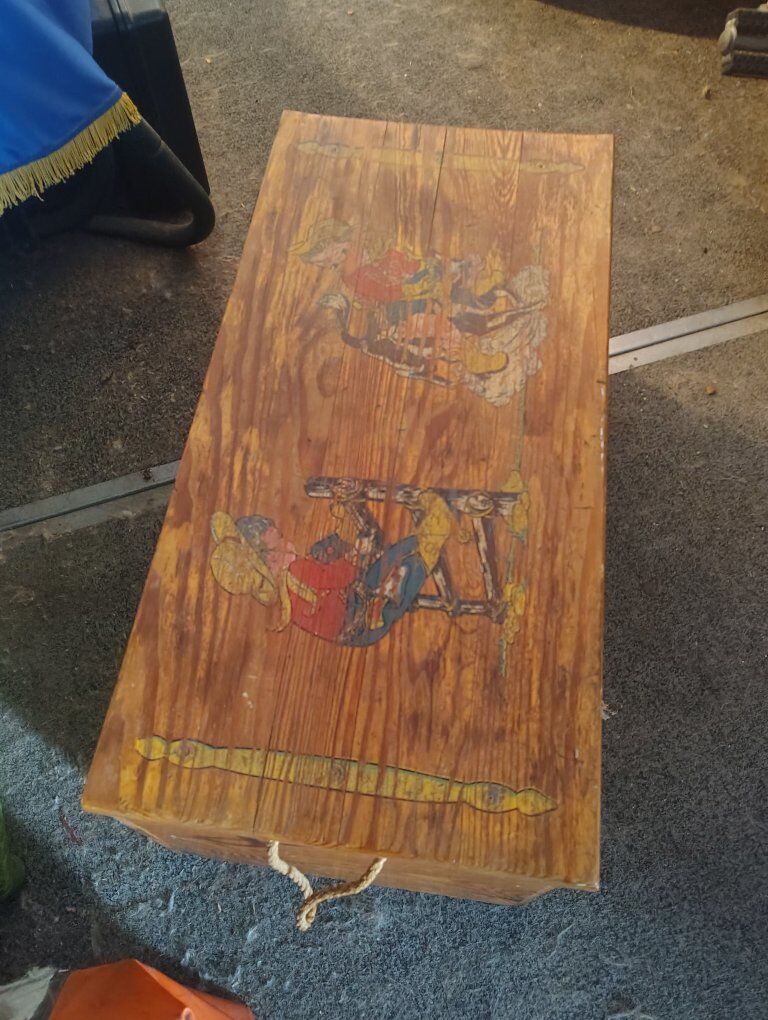 old vintage 1950s '60s little kids wood toy box with graphics on the top lid and $75 for sale in West valley.