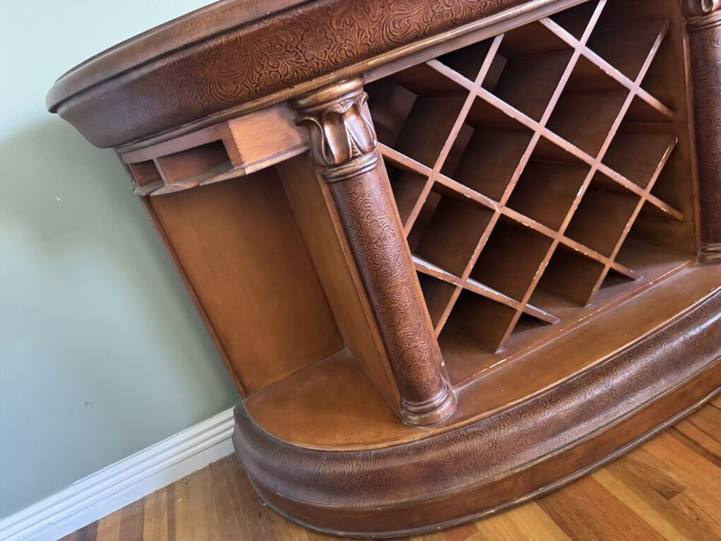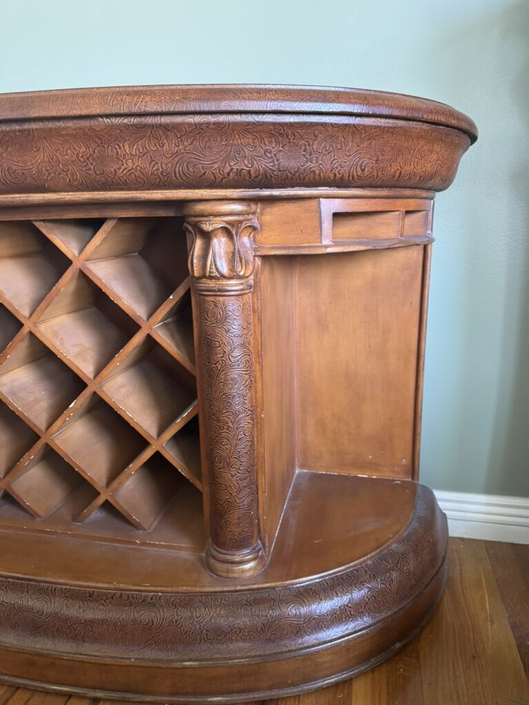 VenmoEntry table side board buffet with wine rack very good condition decorative tooled leather design on top. OBO 53 inch wide 17 inch depth 33 inch height.