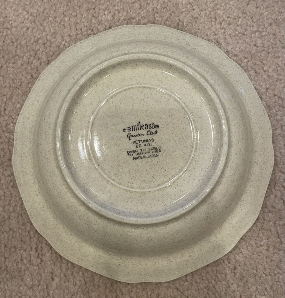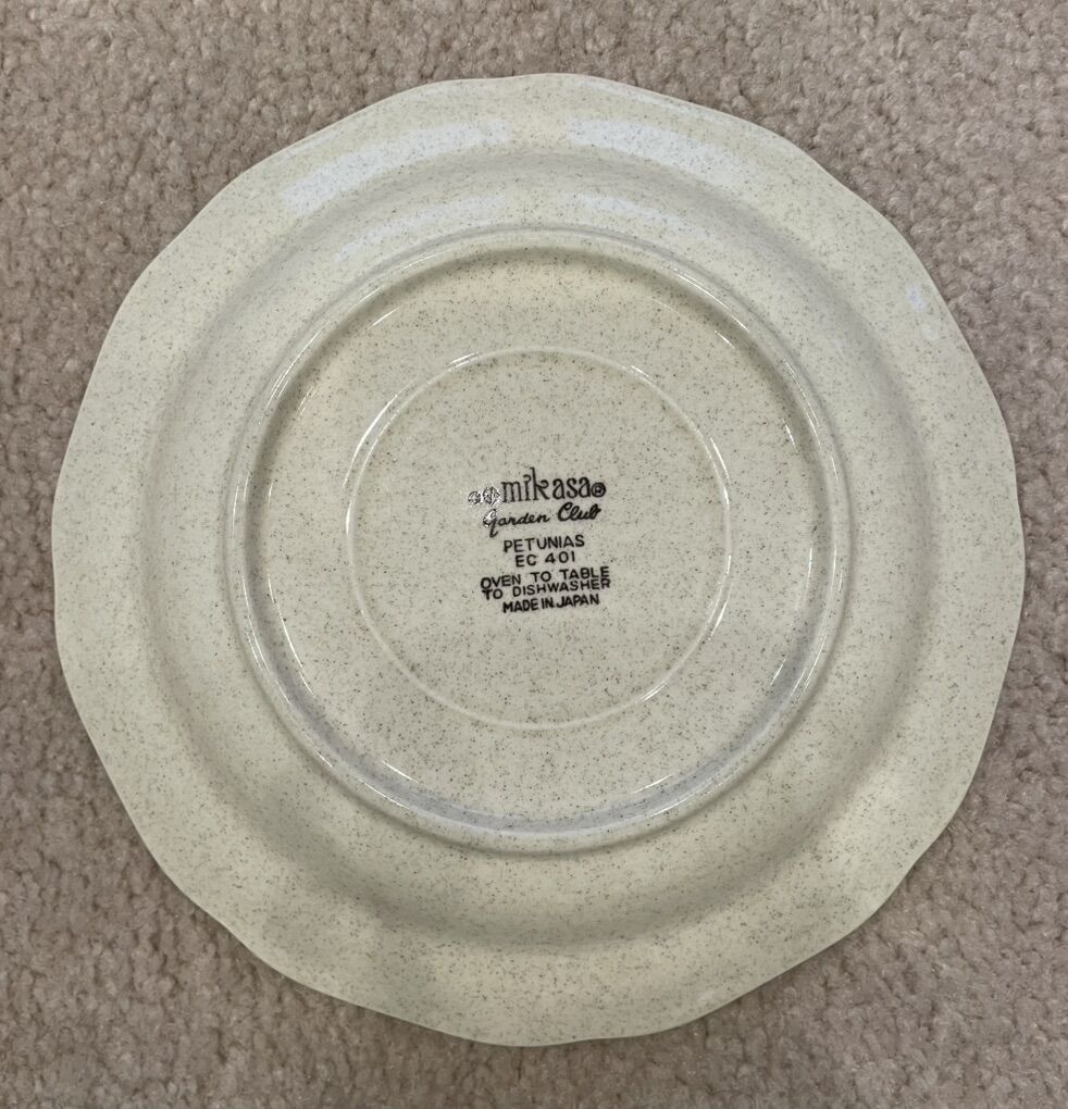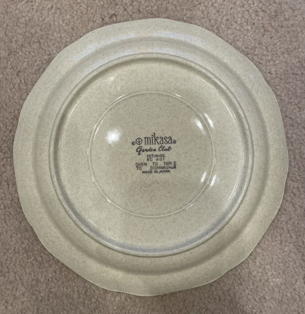VenmoThese vintage Mikasa Speckled Stoneware dishes are in excellent condition. They are in the EC 400 and EC401 Garden Club Petunias series. Made in Japan. They are beautifully designed and will add a stunning look to any table. Good for using on any occasion and for everyday use. From oven to table. The set includes: 1- 12” serving platter 10- 10.5” Dinner plates 10- 8” salad/lunch plates 5- 8” Soup bowls 5- 7” Cereal bowls 1- 3.5” Set Salt and Pepper shakers
