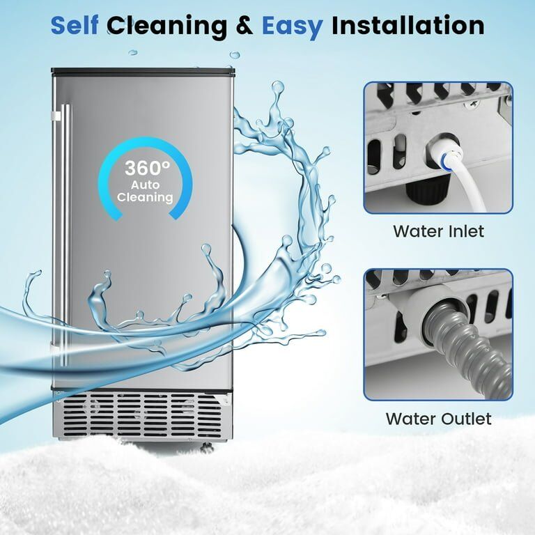 Item Details Efficient Production: Produces 80 lbs of ice per 24 hours with a rapid 11-20 minute ice-making cycle, suitable for both commercial and residential use. Customizable Ice: Features 12 adjustable ice cube thickness levels (7-11 mins) and a 24-hour timer for automated operation. Ample Storage: Includes a large, removable ice bin with a 24 lbs capacity, complemented by a thickened insulation layer to reduce melting. User-Friendly Design: Equipped with an LCD display, self-cleaning function, and efficient drainage system for easy operation and maintenance. Flexible Installation: Designed for freestanding or under-counter placement with front-facing ventilation, reversible door, and quick setup with included water inlet/outlet pipes. Durable Construction: Constructed from high-quality stainless steel and zinc-plate sheet, ensuring long-term durability.