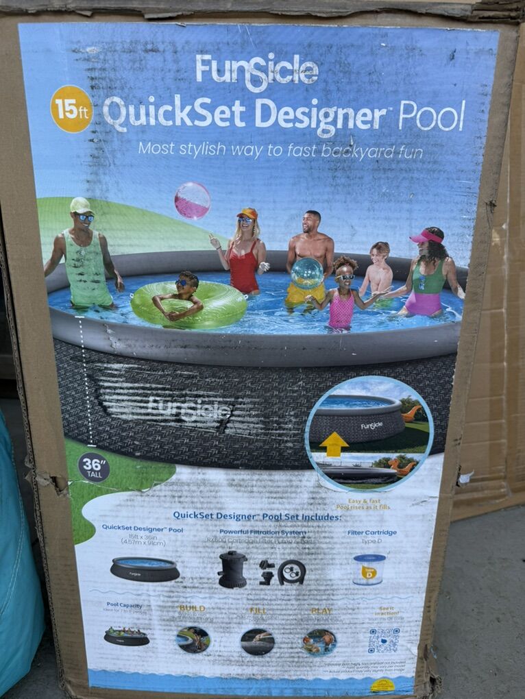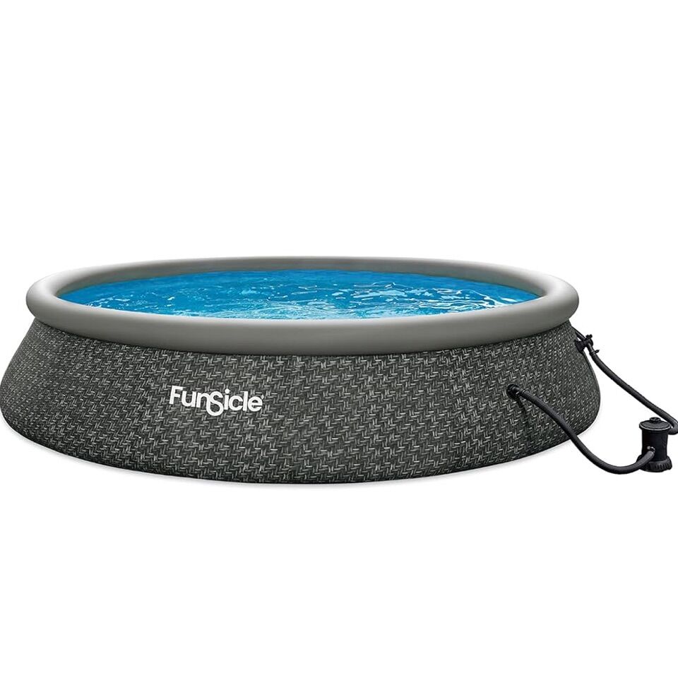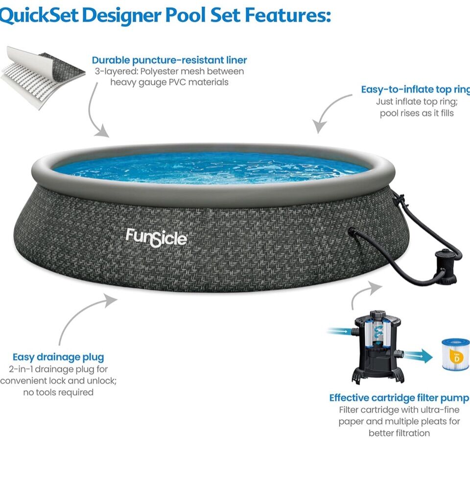 Spacious Round Above-Ground Pool: Measuring 15 feet in diameter and 36 inches deep, this outdoor pool is perfect for both kids and adults to cool off and relax in the backyard while accommodating up to 8 people, offering hours of splashing enjoyment Easy Setup with Inflatable Top Ring: Simply inflate the top ring and watch the pool rise as it fills with water, providing a quick and hassle-free setup to splash around the water in minutes Durable ToughMesh Construction: Made from materials that resist punctures for lasting durability, ensuring your swimming pool stays in great shape throughout the summer season Included Accessories: Comes with a 110-120V RX200 filter pump, GFCI, Type D filter cartridge for easy maintenance, and a repair patch for quick fixes in case of accidents