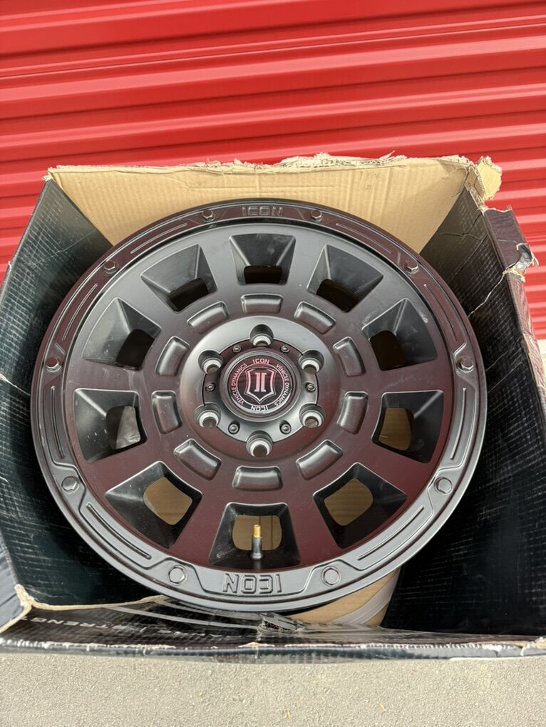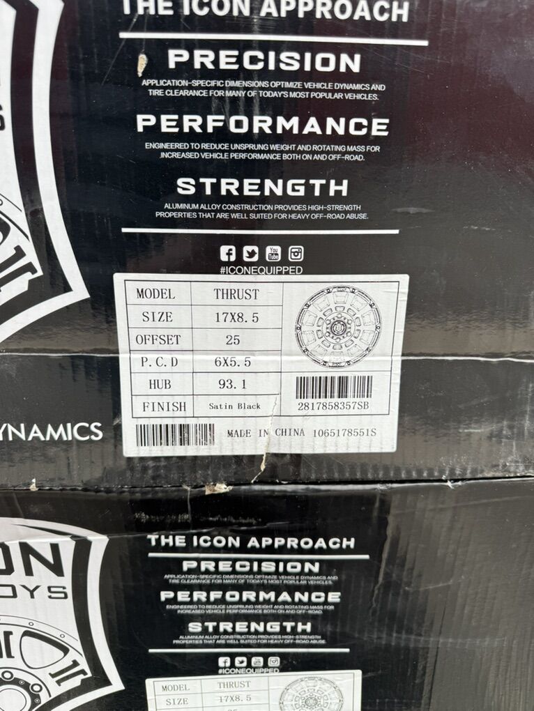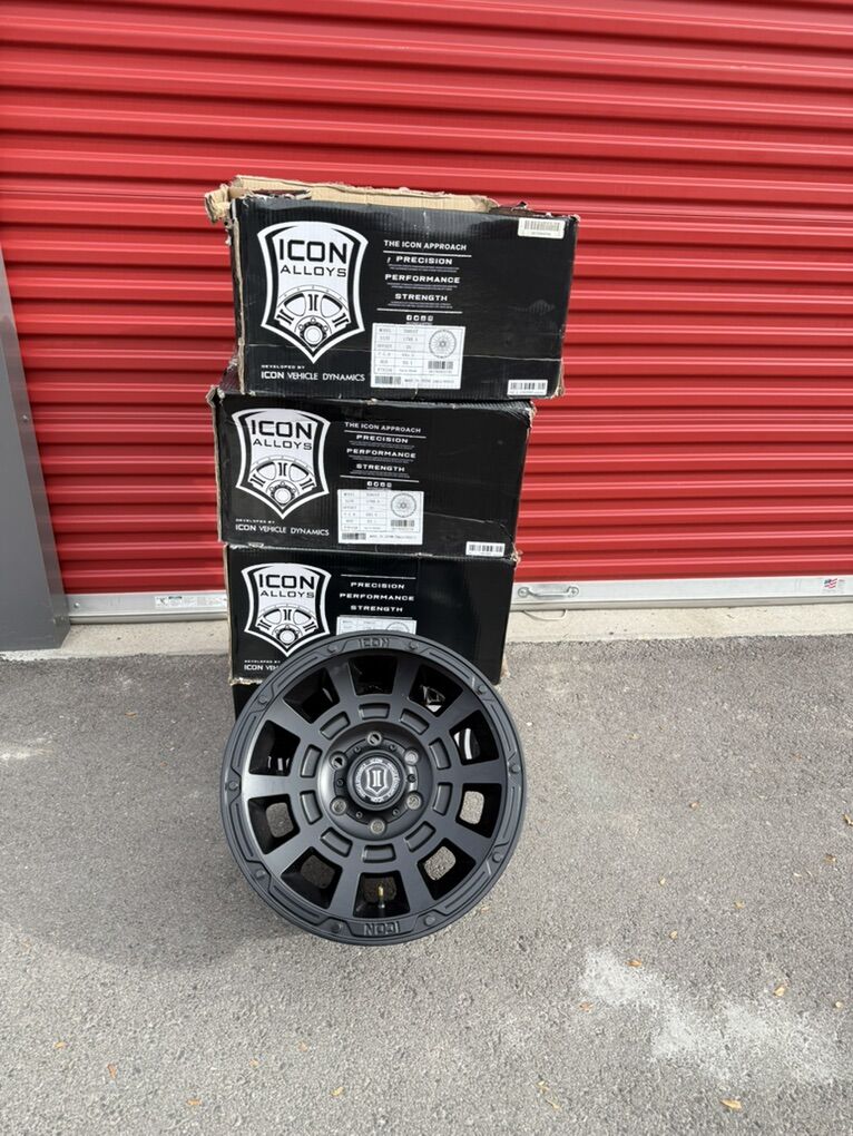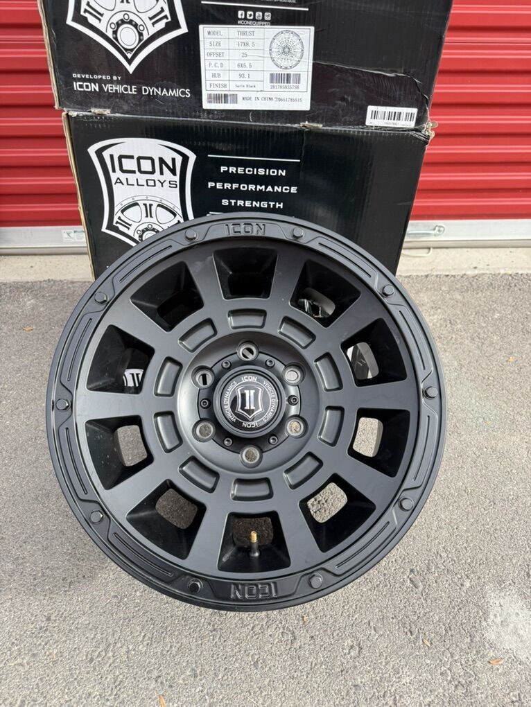 ApplePaySet of 4-Ford Ranger Chevy Silverado Colorado GMC Canyon Icon Alloys Thrust 17x8.5 +25 Brand New asking $800 obo MODEL-THRUST SIZE 17X8. 5 OFFSET +25 Bolt pattern 6X5.5 HUB 93.1 FINISH Satin Black They will Chevy Silverado 1500 Tahoe Suburban avalanche Colorado GMC Sierra 1500 Denali Yukon Canyon Text anytime 385-402-2292